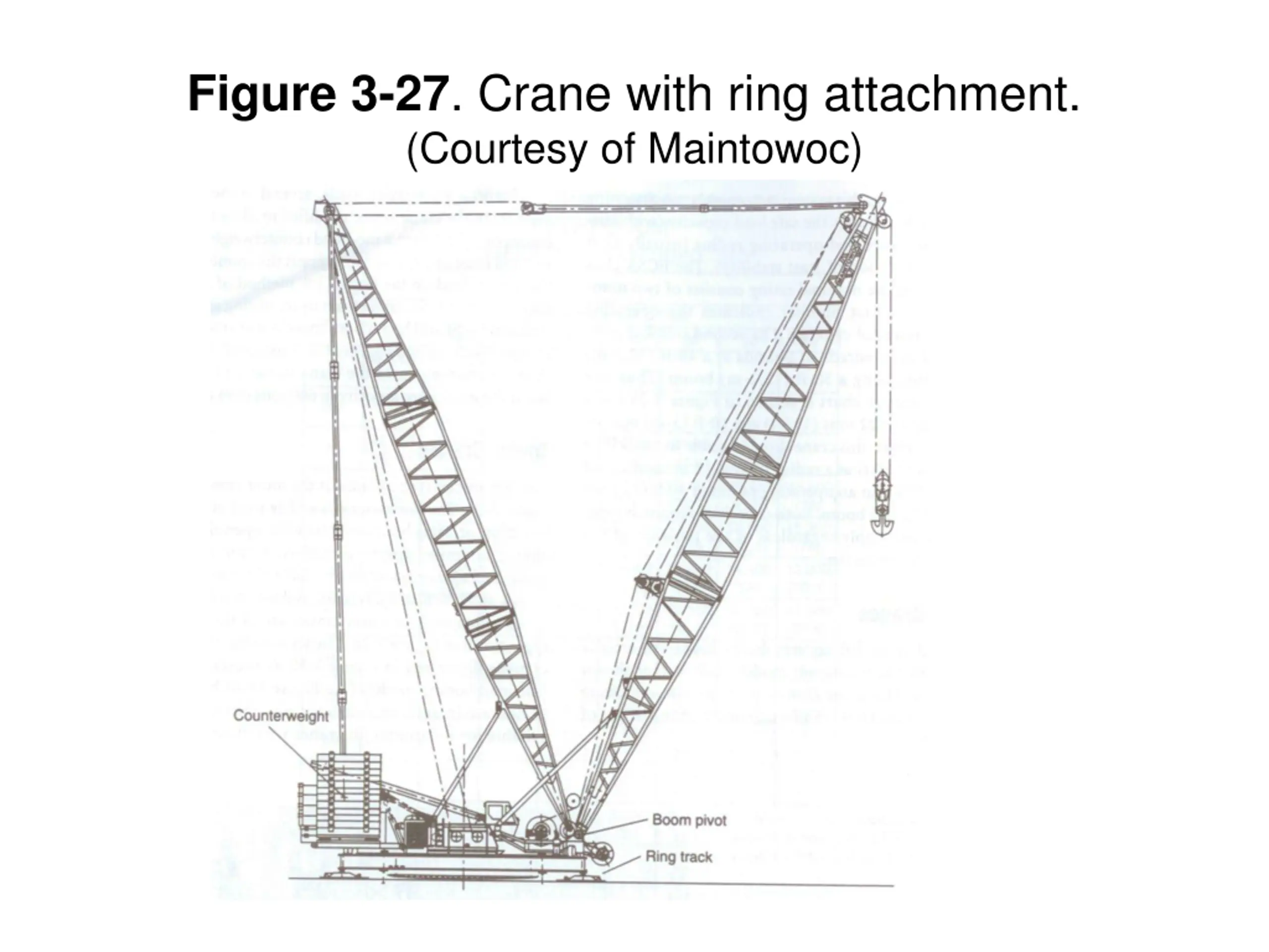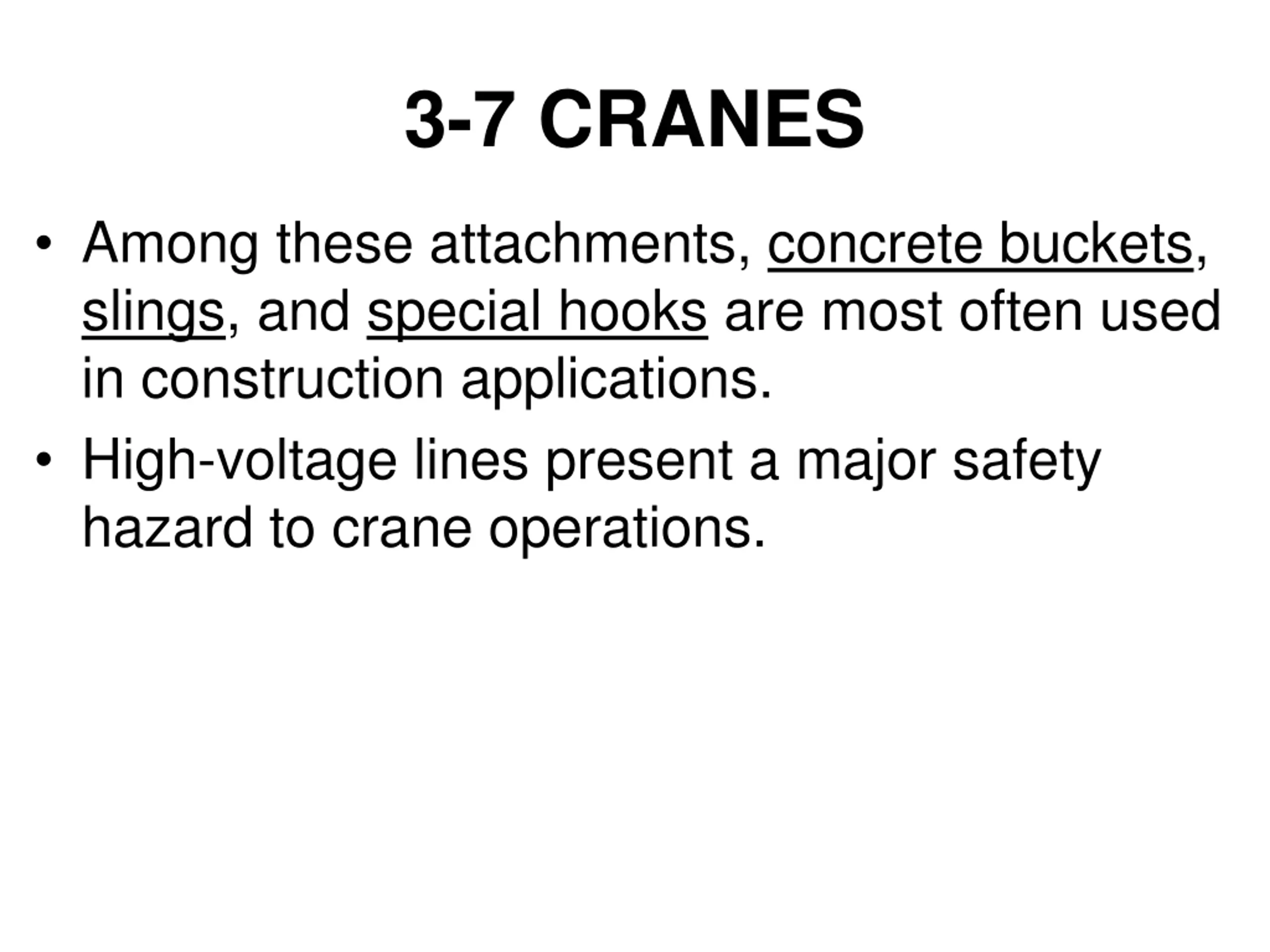 3-7 CRANES Among these attachments, concrete buckets, slings, and special hooks are most often used in construction applications. High-voltage lines present a major safety hazard to crane operations.