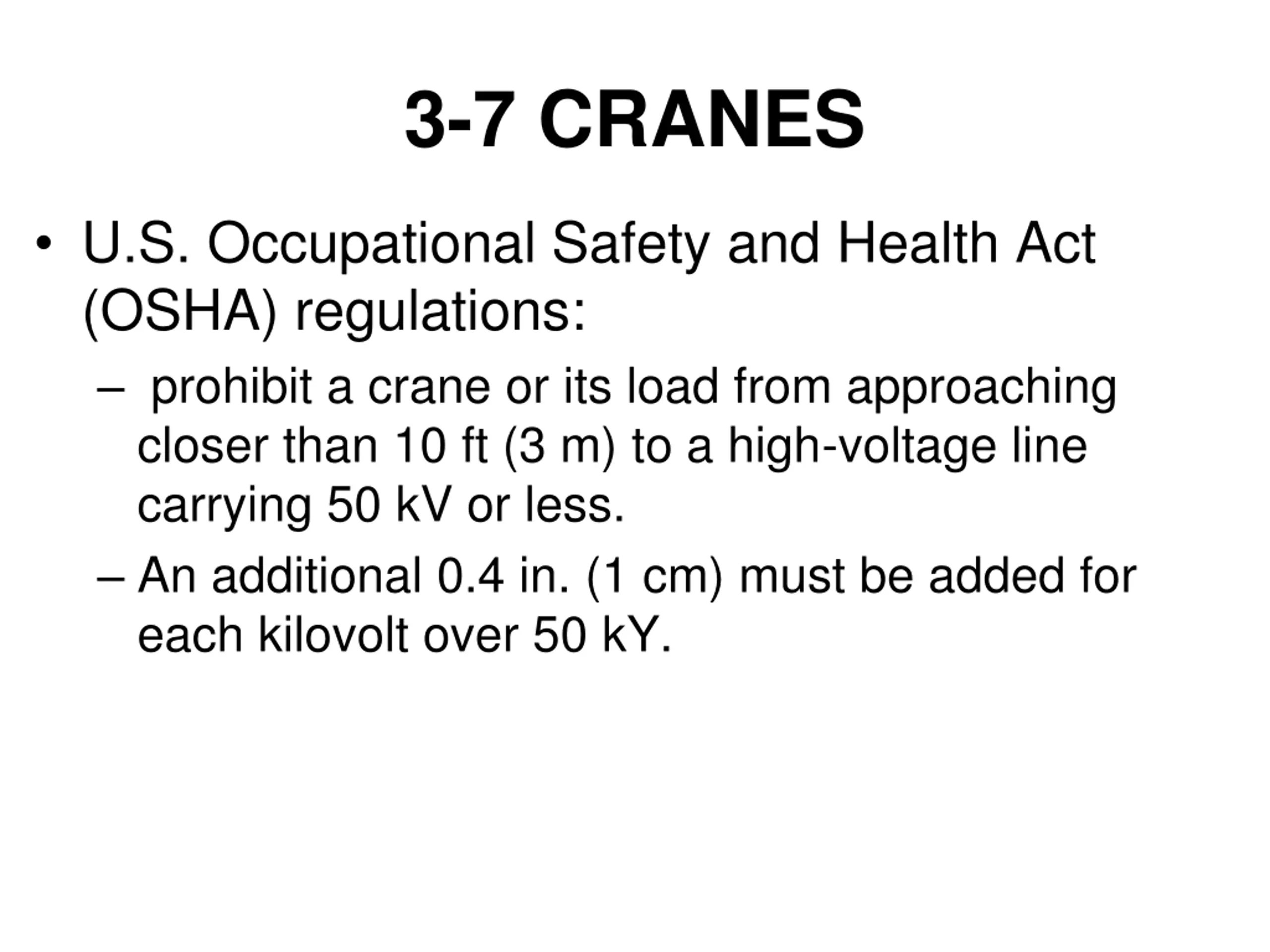 3-7 CRANES U.S. Occupational Safety and Health Act (OSHA) regulations: prohibit a crane or its load from approaching closer than 10 ft (3 m) to a high-voltage line carrying 50 kV or less. An additional 0.4 in. (1 cm) must be added for each kilovolt over 50 kY.