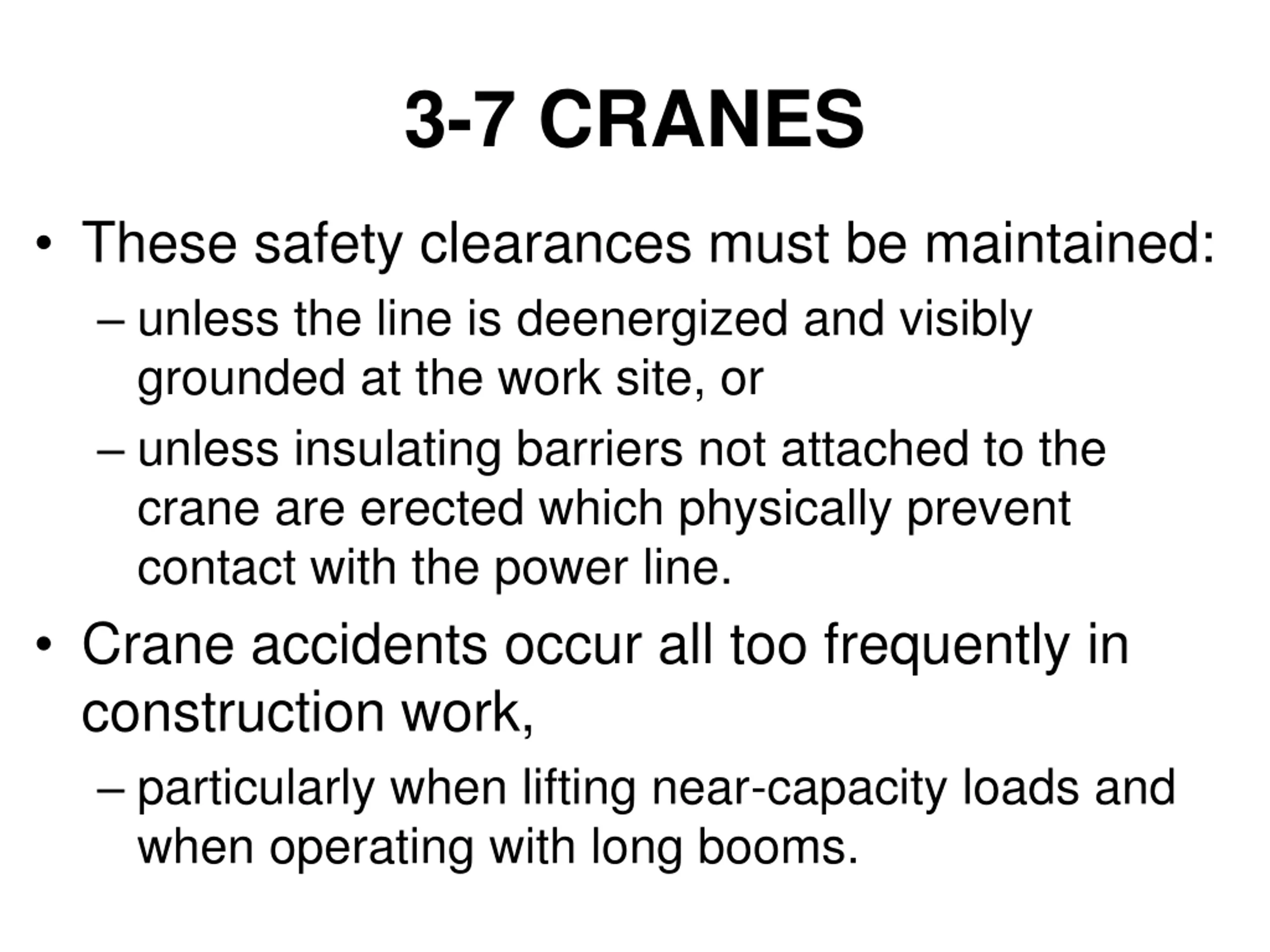 3-7 CRANES These safety clearances must be maintained: unless the line is deenergized and visibly grounded at the work site, or unless insulating barriers not attached to the crane are erected which physically prevent contact with the power line. Crane accidents occur all too frequently in construction work, particularly when lifting near-capacity loads and when operating with long booms.