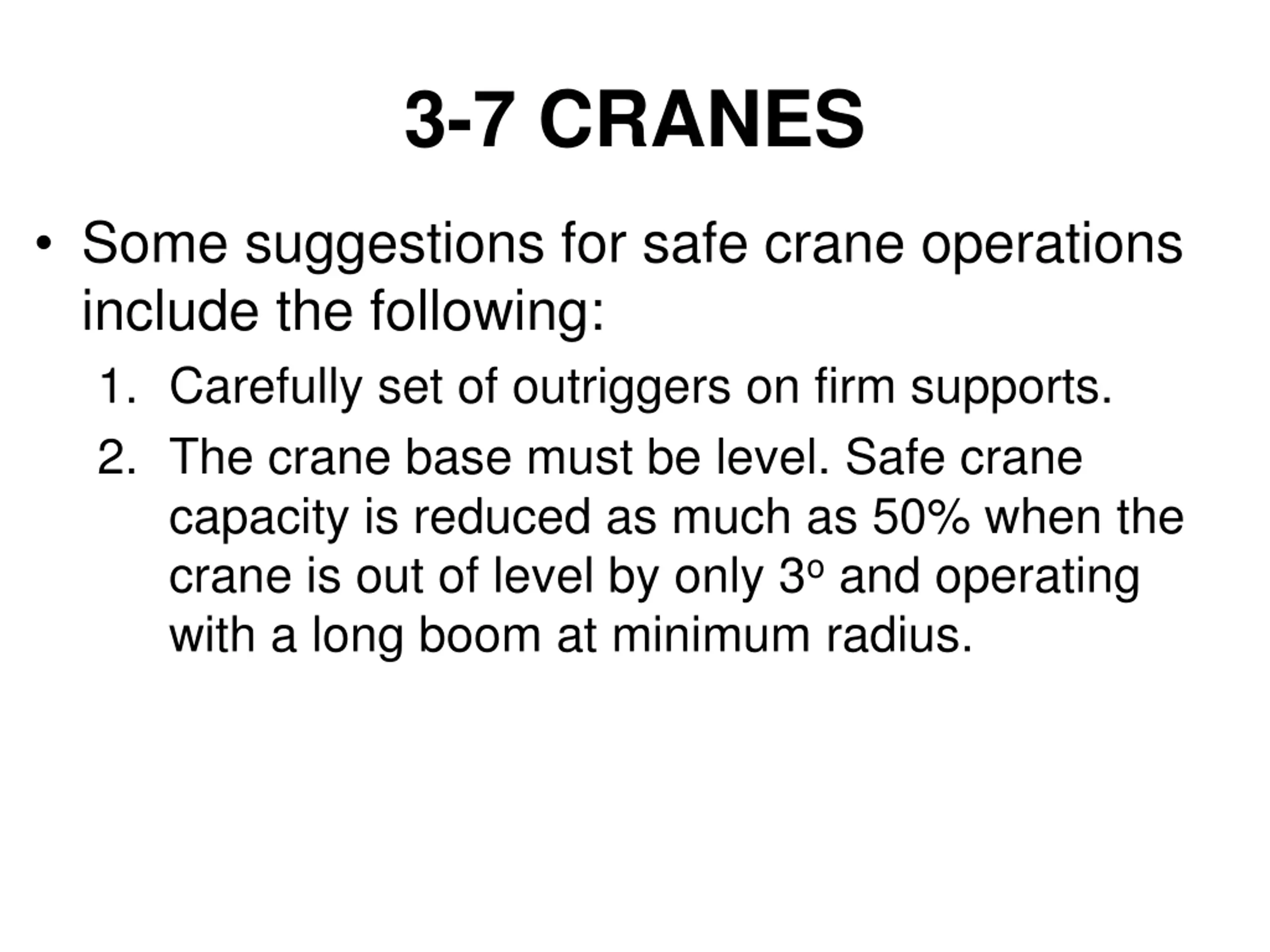 3-7 CRANES Some suggestions for safe crane operations include the following: 1. Carefully set of outriggers on firm supports. 2. The crane base must be level. Safe crane capacity is reduced as much as 50% when the crane is out of level by only 3oand operating with a long boom at minimum radius.