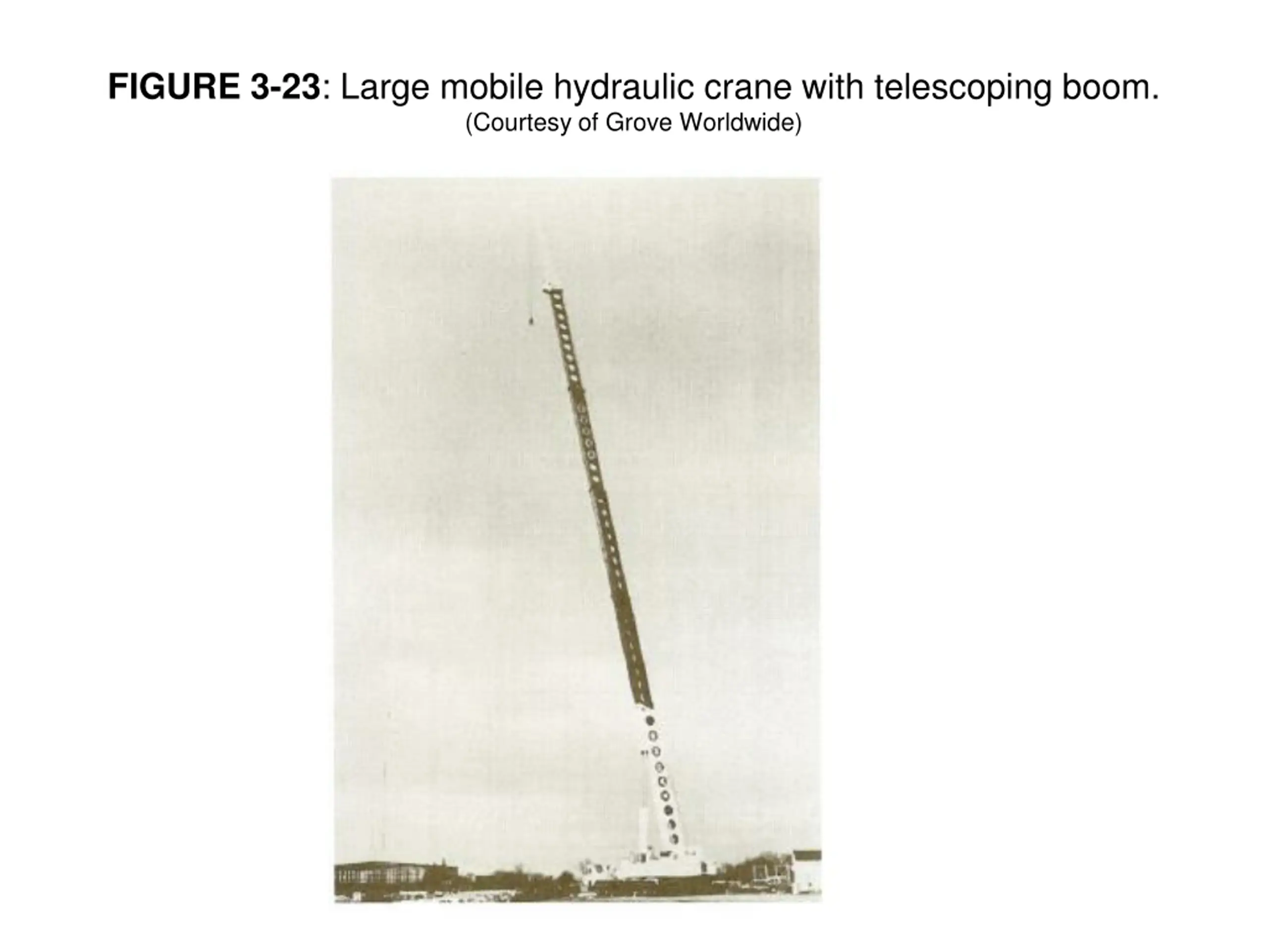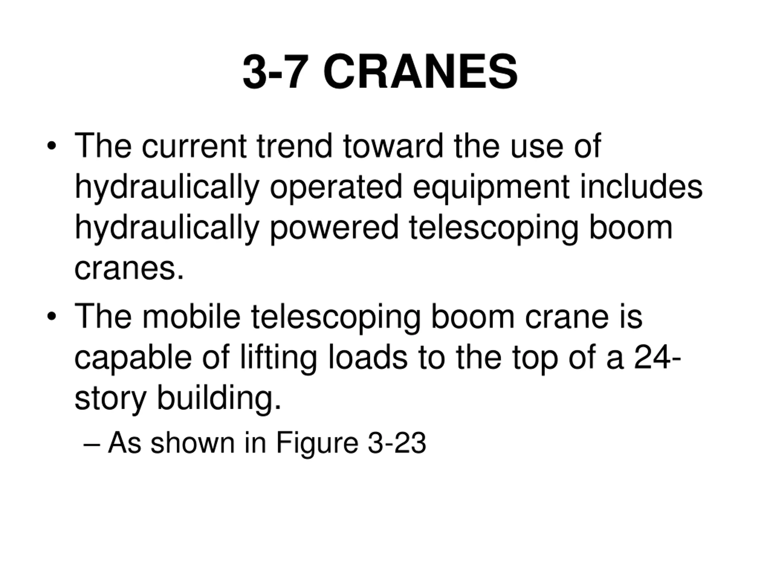 3-7 CRANES The current trend toward the use of hydraulically operated equipment includes hydraulically powered telescoping boom cranes. The mobile telescoping boom crane is capable of lifting loads to the top of a 24- story building. As shown in Figure 3-23