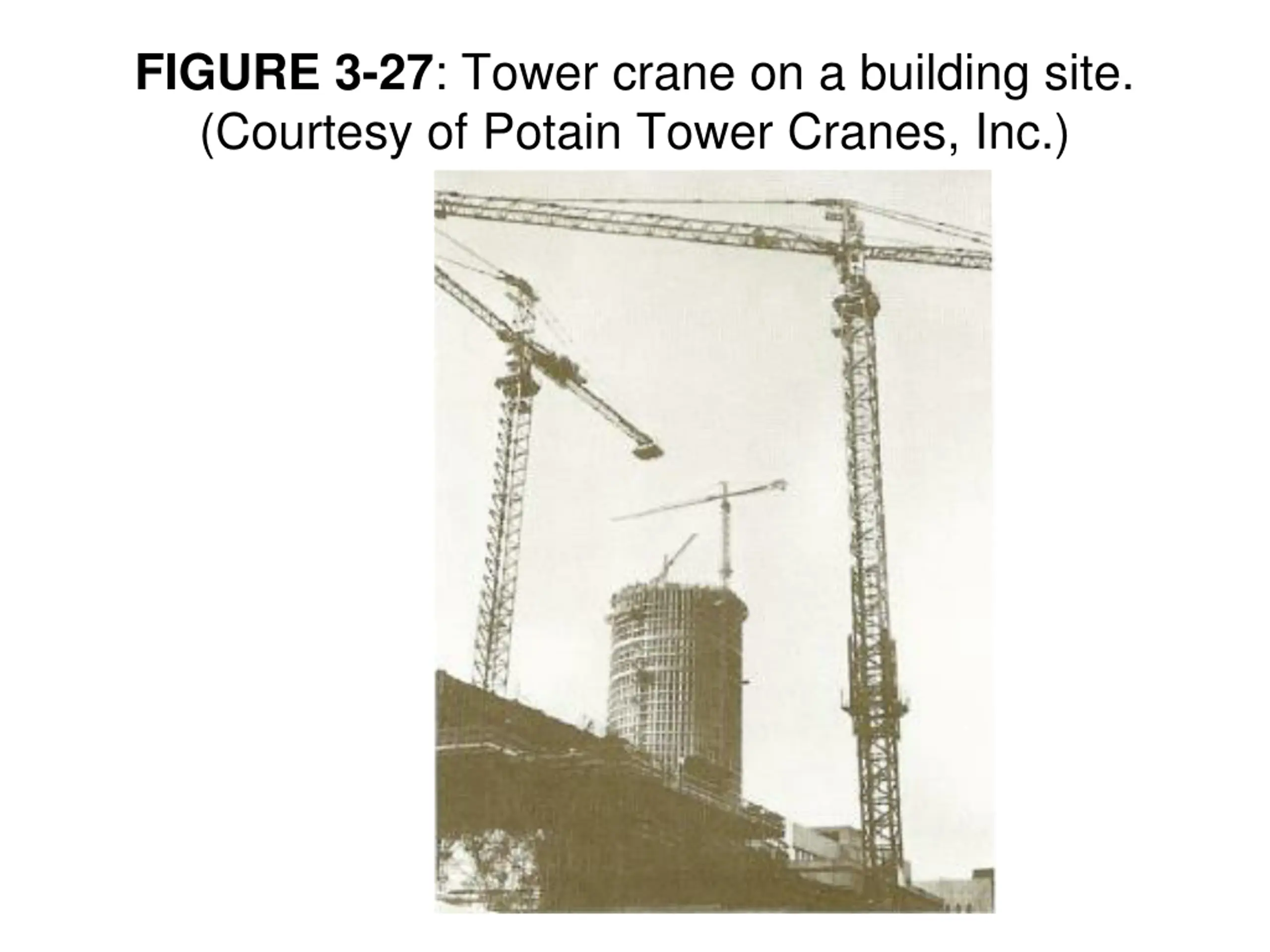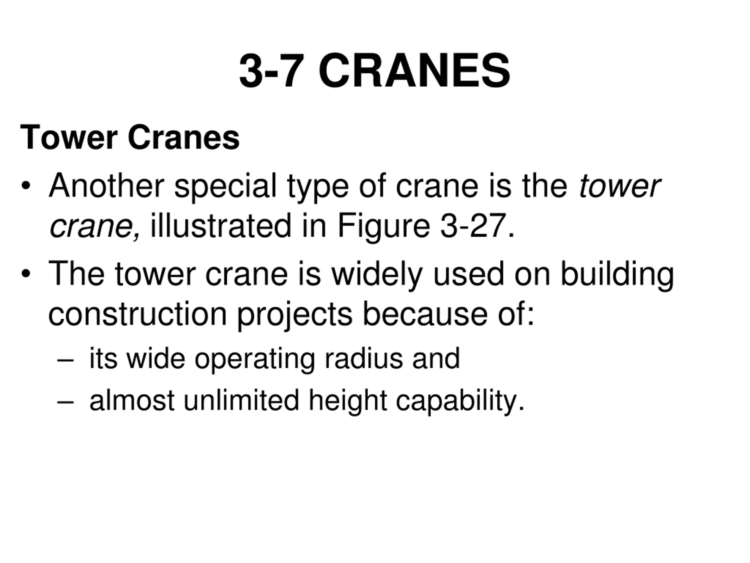 3-7 CRANES Tower Cranes Another special type of crane is the tower crane, illustrated in Figure 3-27. The tower crane is widely used on building construction projects because of: its wide operating radius and almost unlimited height capability.