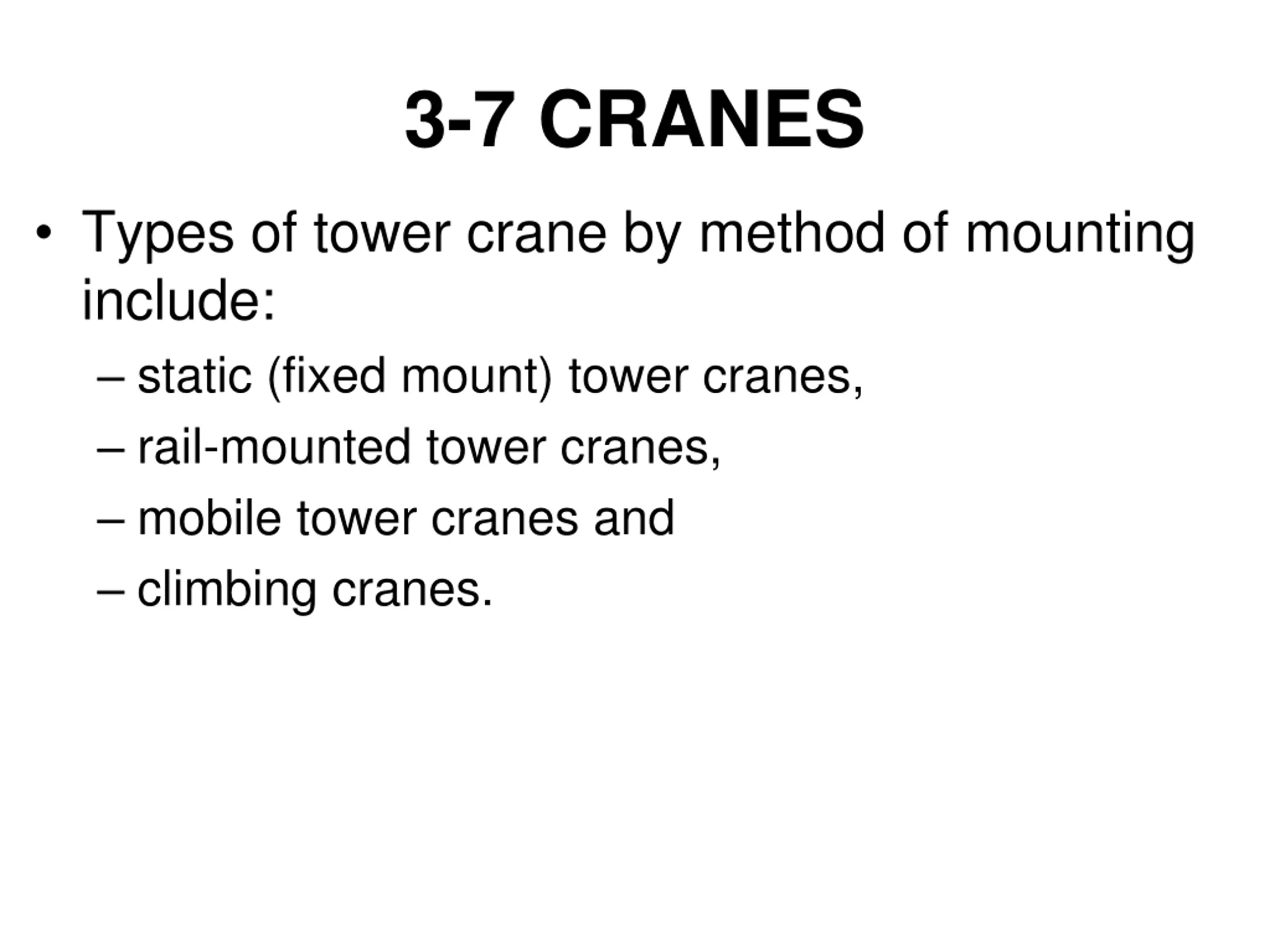3-7 CRANES Types of tower crane by method of mounting include: static (fixed mount) tower cranes, rail-mounted tower cranes, mobile tower cranes and climbing cranes.