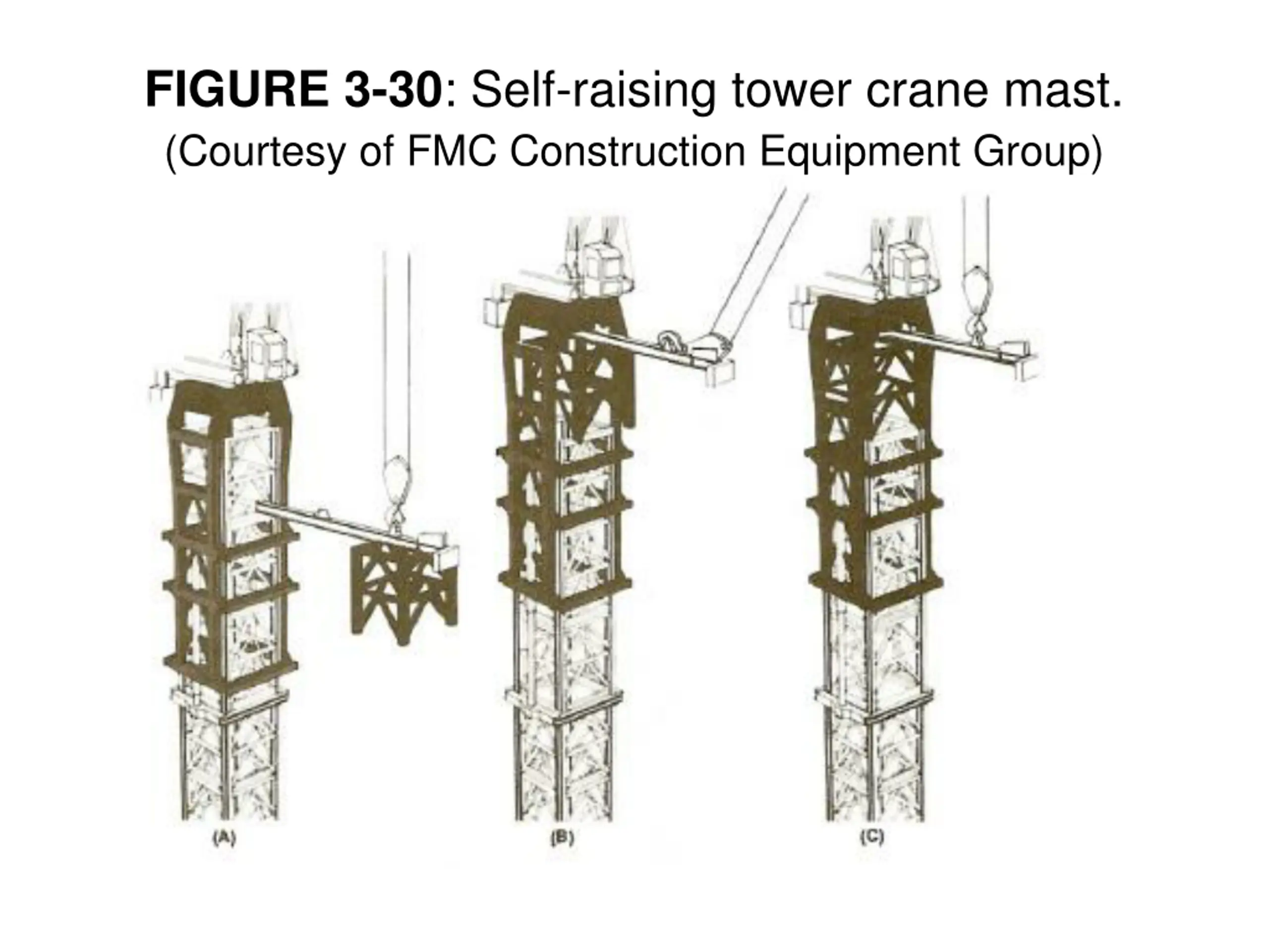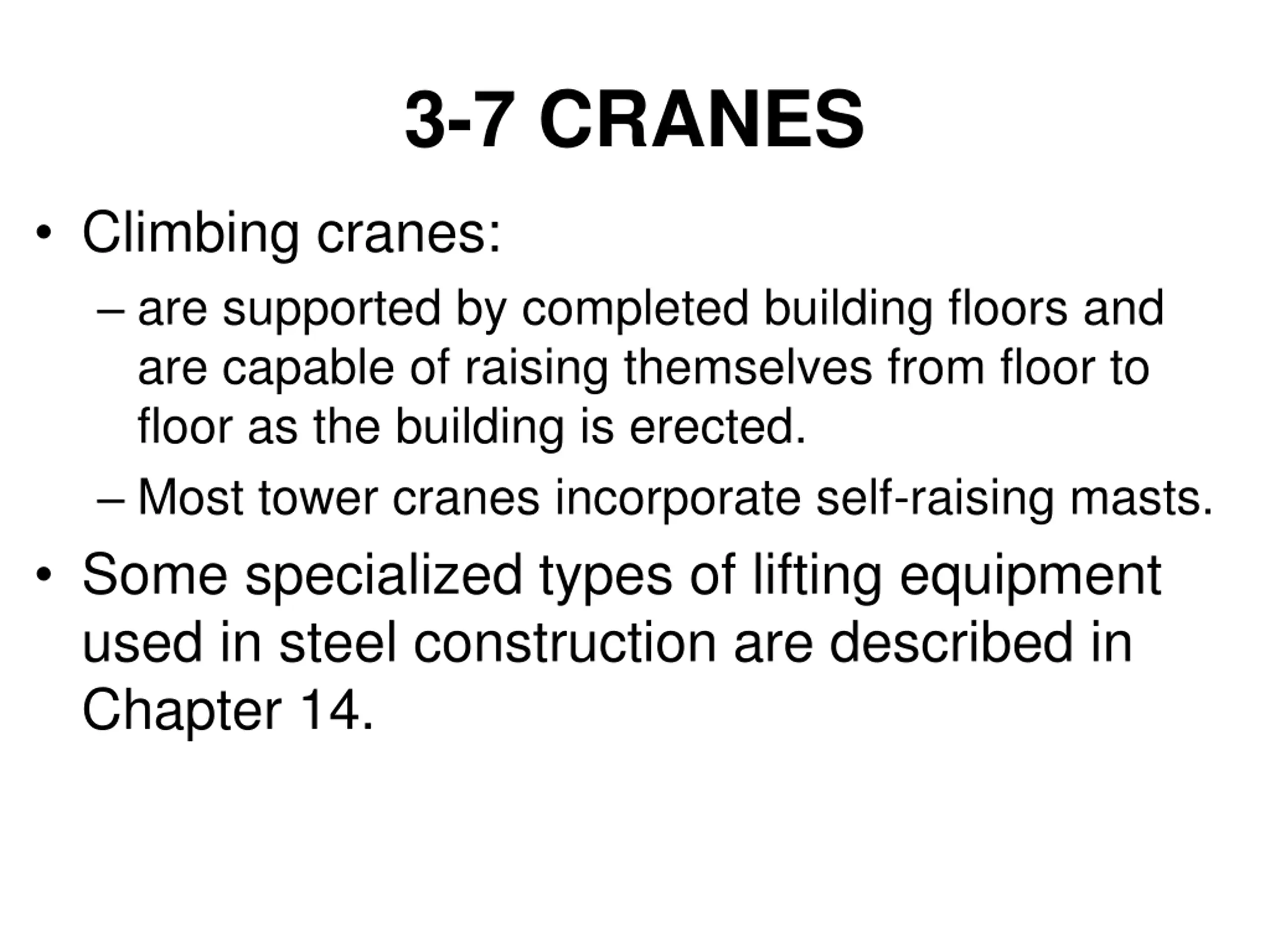 3-7 CRANES Climbing cranes: are supported by completed building floors and are capable of raising themselves from floor to floor as the building is erected. Most tower cranes incorporate self-raising masts. Some specialized types of lifting equipment used in steel construction are described in Chapter 14.
