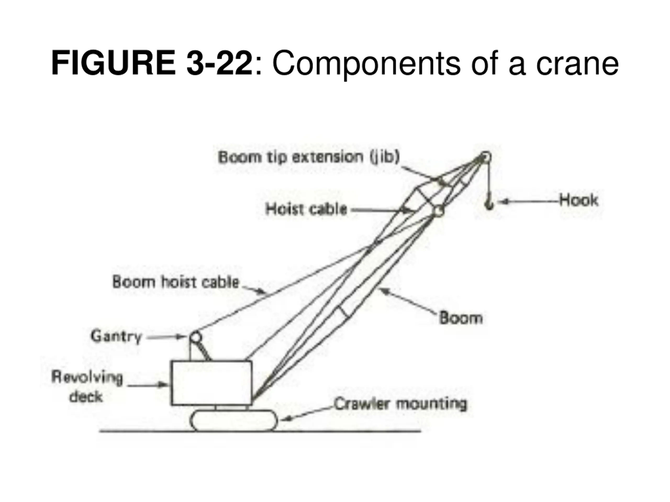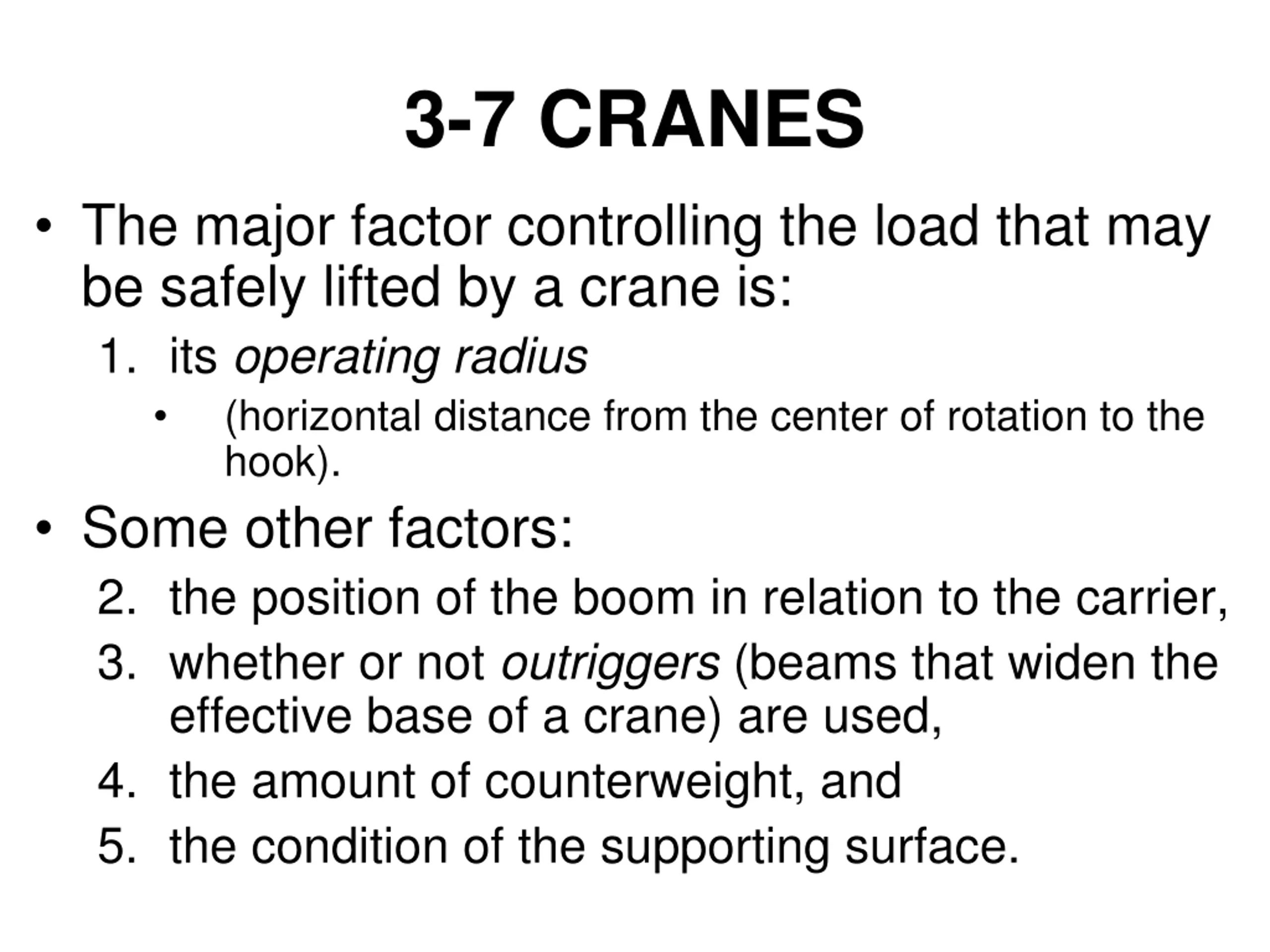 3-7 CRANES The major factor controlling the load that may be safely lifted by a crane is: 1. its operating radius (horizontal distance from the center of rotation to the hook). Some other factors: 2. the position of the boom in relation to the carrier, 3. whether or not outriggers (beams that widen the effective base of a crane) are used, 4. the amount of counterweight, and 5. the condition of the supporting surface.