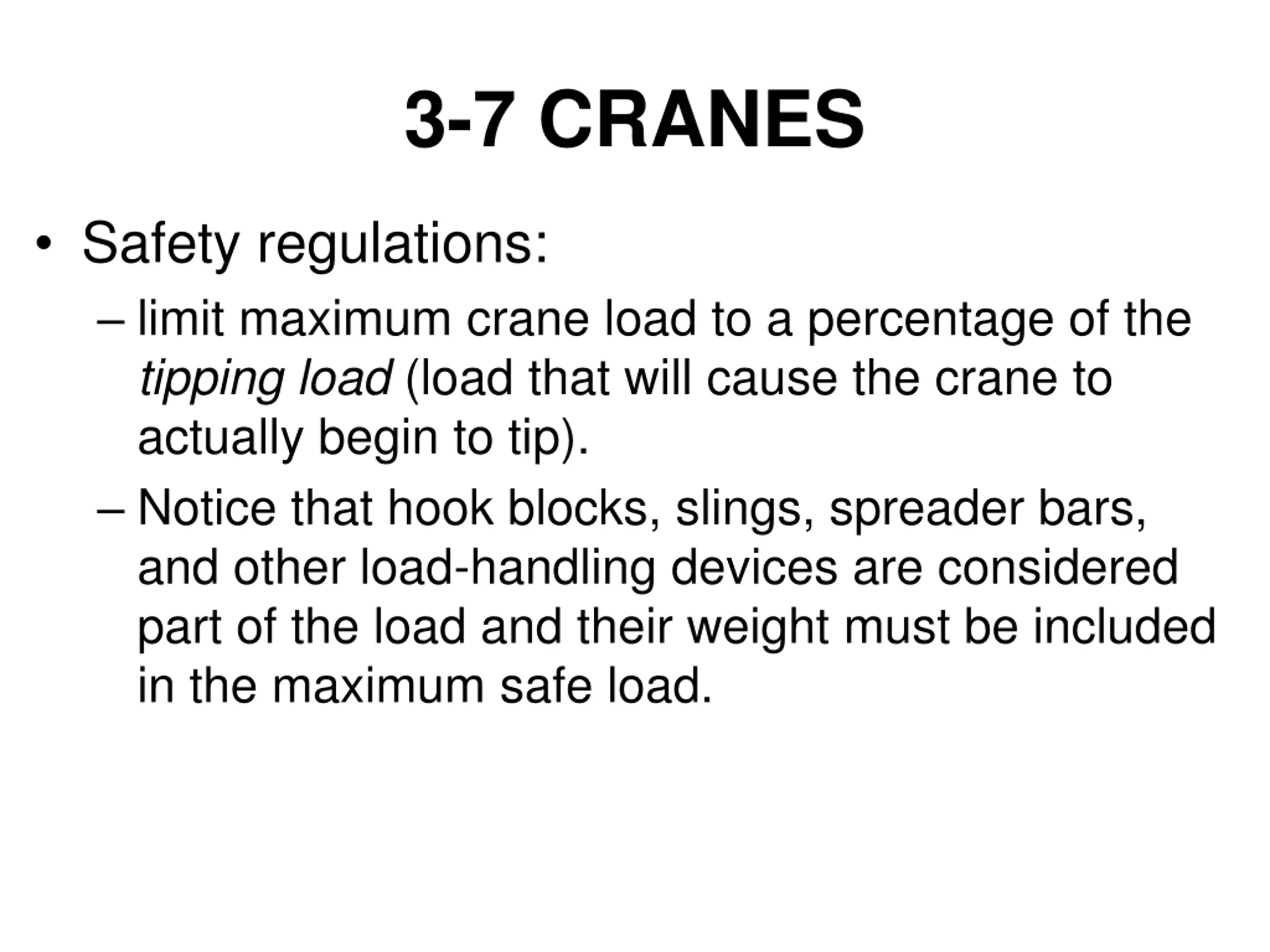 3-7 CRANES Safety regulations: limit maximum crane load to a percentage of the tipping load (load that will cause the crane to actually begin to tip). Notice that hook blocks, slings, spreader bars, and other load-handling devices are considered part of the load and their weight must be included in the maximum safe load.