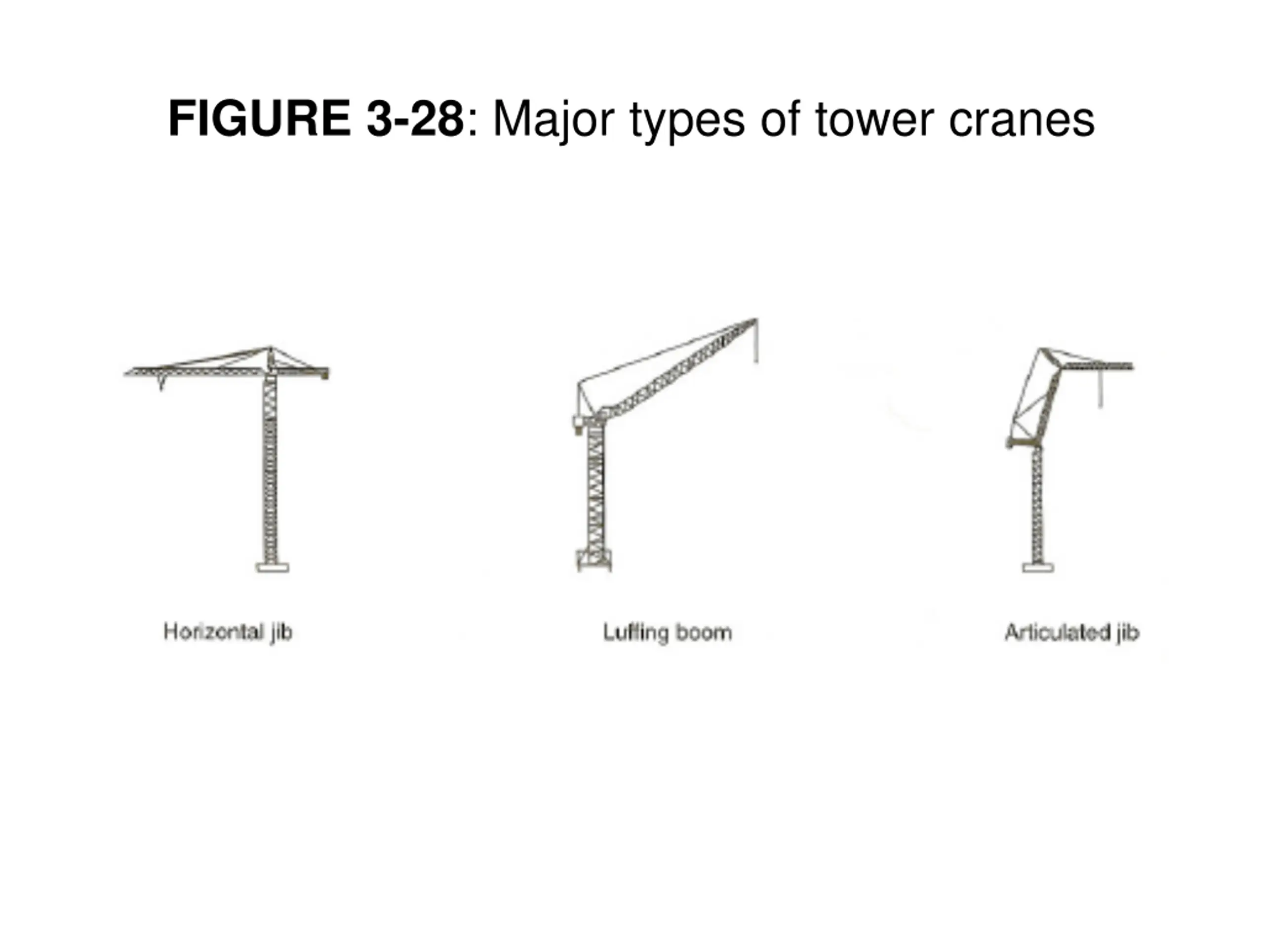 3-7 CRANES Tower Cranes Major types of tower cranes include (Figure 3-28): horizontal jib (or saddle jib) cranes, luffing boom cranes, and articulated jib cranes Thus, such Tower cranes can be operated in either the horizontal or luffed position.