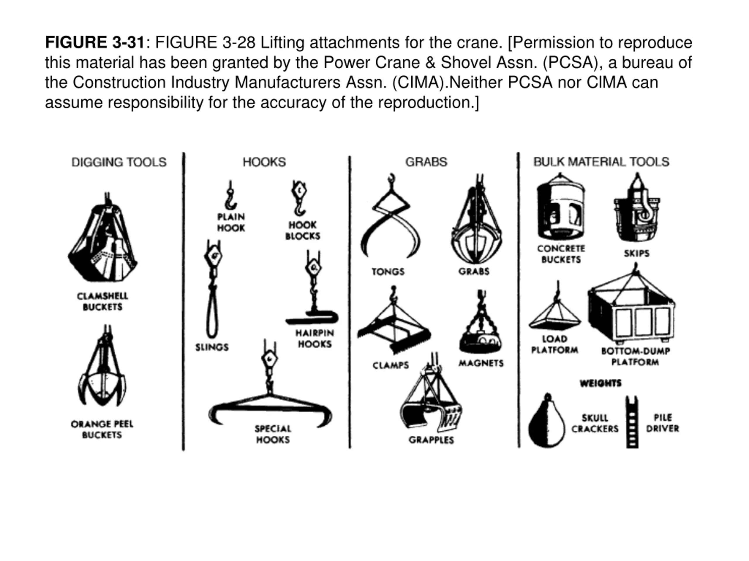 FIGURE 3-31: FIGURE 3-28 Lifting attachments for the crane. [Permission to reproduce this material has been granted by the Power Crane & Shovel Assn. (PCSA), a bureau of the Construction Industry Manufacturers Assn. (CIMA).Neither PCSA nor ClMA can assume responsibility for the accuracy of the reproduction.]