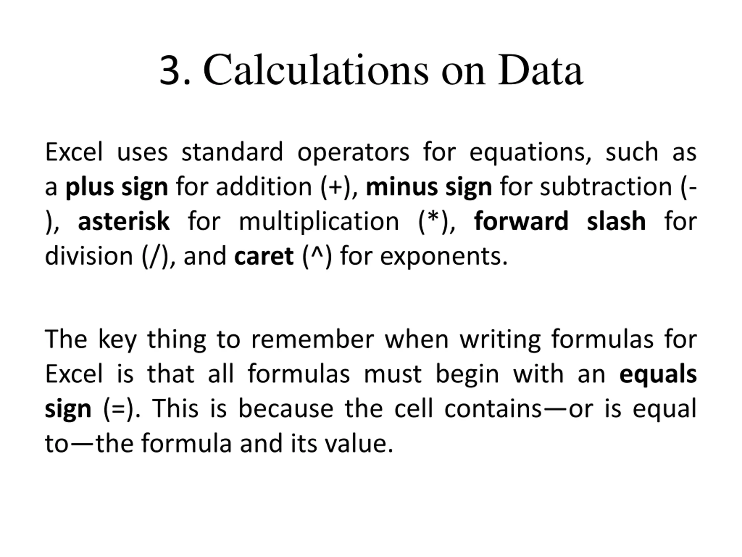 3. Calculations on Data Excel uses standard operators for equations, such as a plus sign for addition (+), minus sign for subtraction (- ), asterisk for multiplication (*), forward slash for division (/), and caret (^) for exponents. The key thing to remember when writing formulas for Excel is that all formulas must begin with an equals sign (=). This is because the cell contains or is equal to the formula and its value.