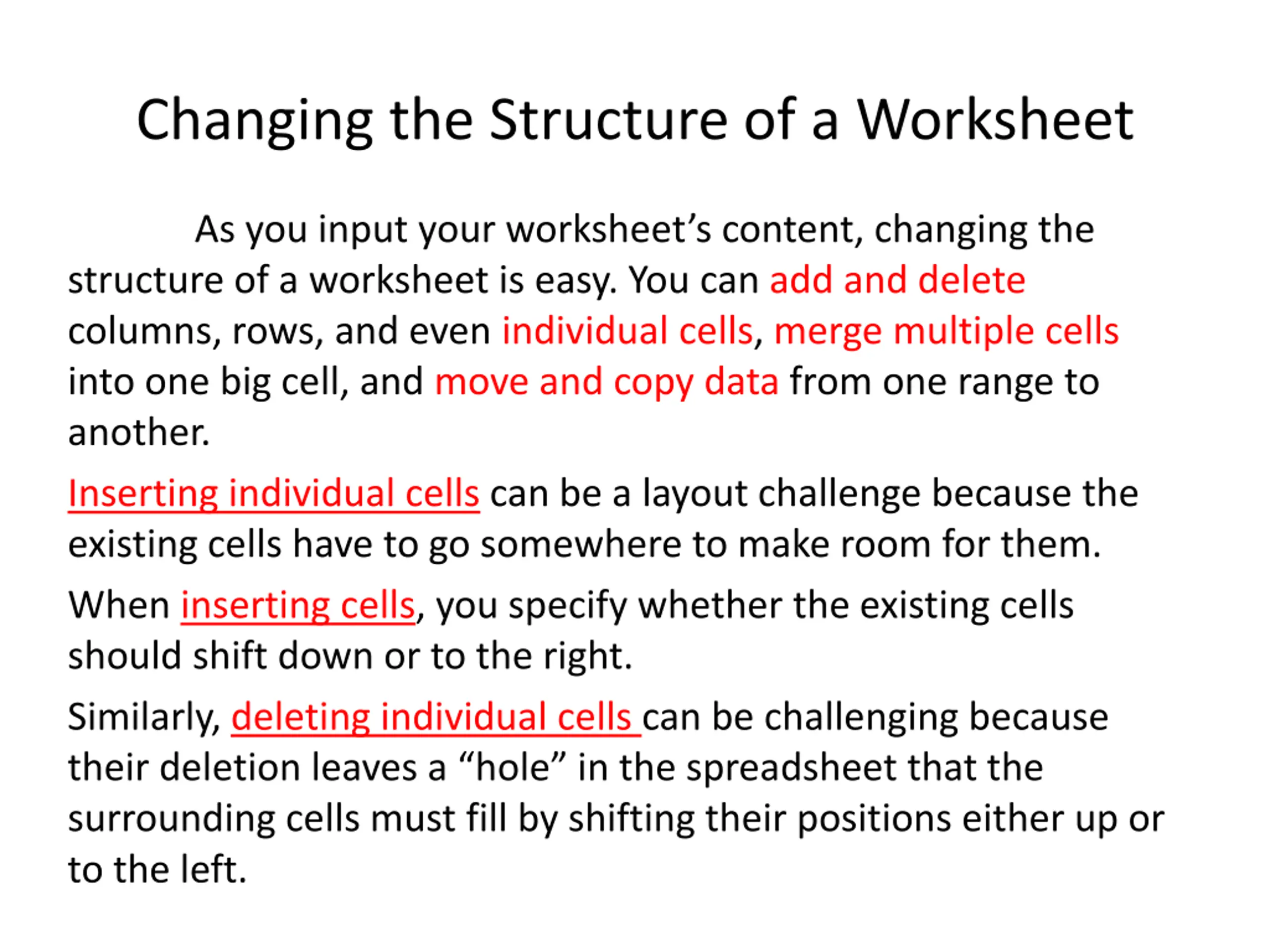Changing the Structure of a Worksheet As you input your worksheet s content, changing the structure of a worksheet is easy. You can add and delete columns, rows, and even individual cells, merge multiple cells into one big cell, and move and copy data from one range to another. Inserting individual cells can be a layout challenge because the existing cells have to go somewhere to make room for them. When inserting cells, you specify whether the existing cells should shift down or to the right. Similarly, deleting individual cells can be challenging because their deletion leaves a hole in the spreadsheet that the surrounding cells must fill by shifting their positions either up or to the left.