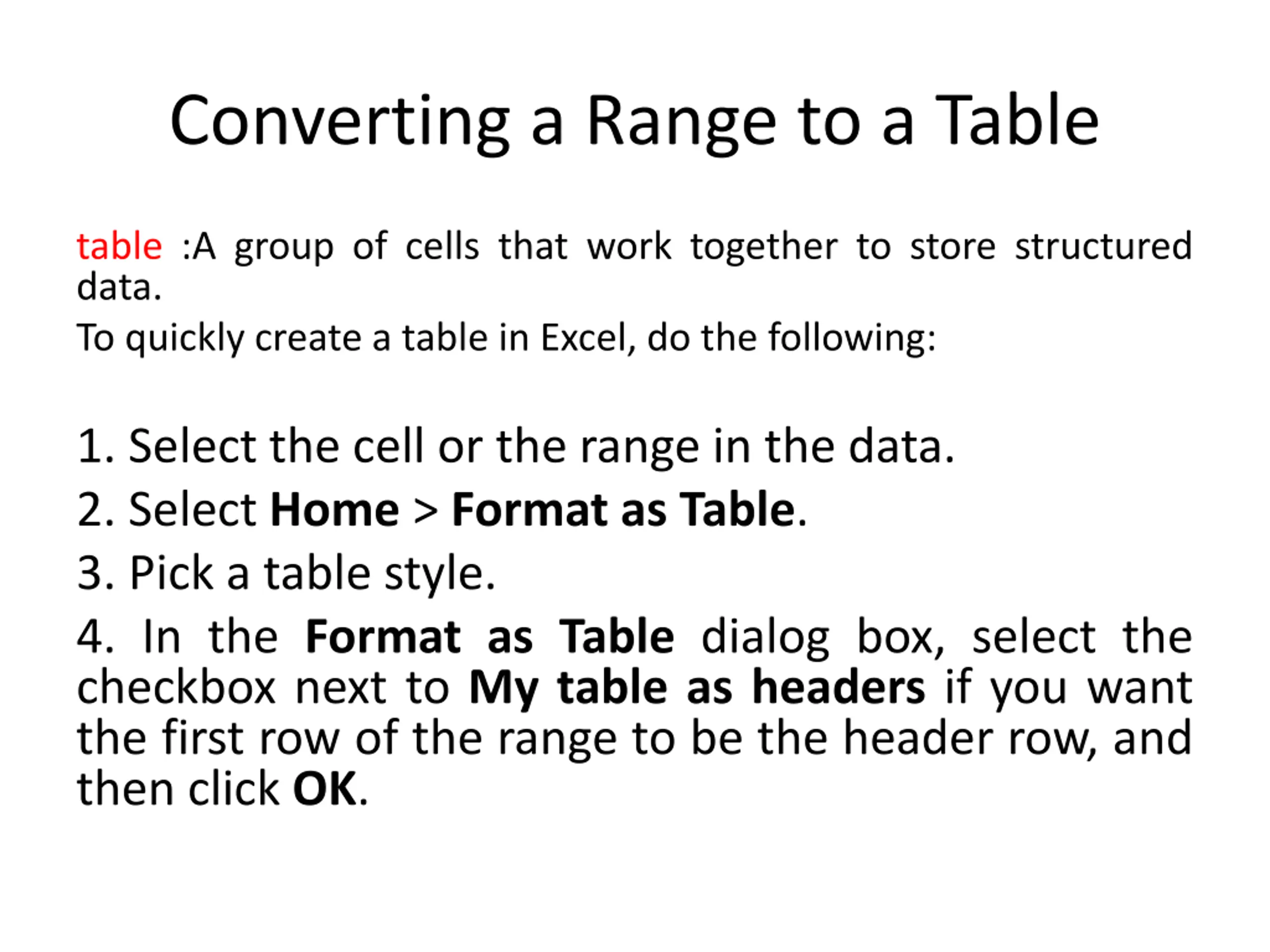 Converting a Range to a Table table :A group of cells that work together to store structured data. To quickly create a table in Excel, do the following: 1. Select the cell or the range in the data. 2. Select Home > Format as Table. 3. Pick a table style. 4. In the Format as Table dialog box, select the checkbox next to My table as headers if you want the first row of the range to be the header row, and then click OK.