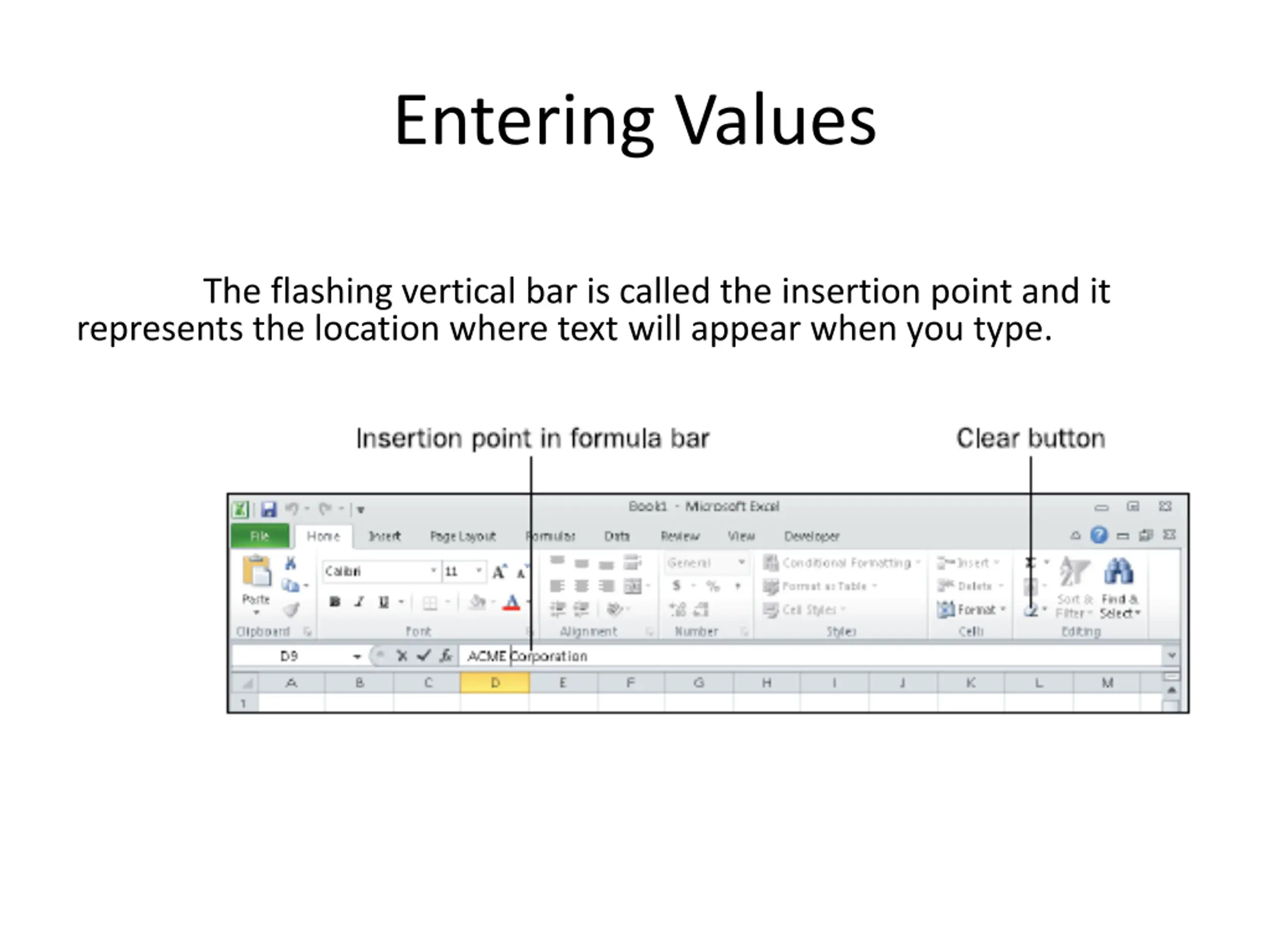 Entering Values The flashing vertical bar is called the insertion point and it represents the location where text will appear when you type.