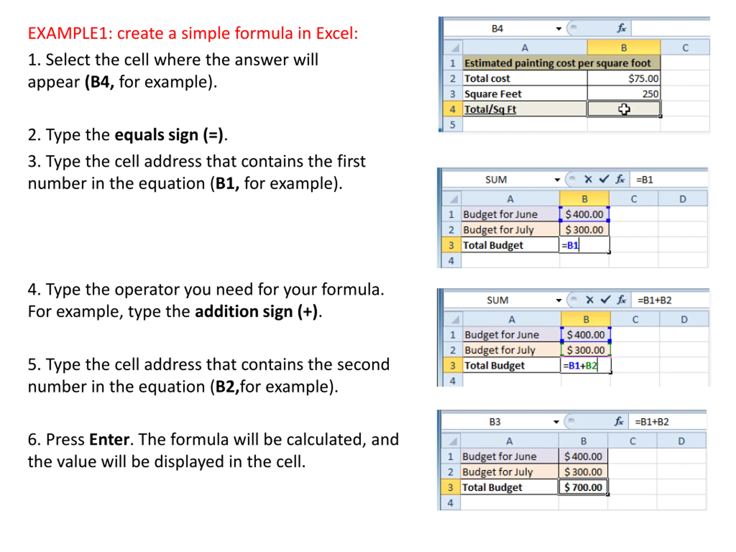 EXAMPLE1: create a simple formula in Excel: 1. Select the cell where the answer will appear (B4, for example). 2. Type the equals sign (=). 3. Type the cell address that contains the first number in the equation (B1, for example). 4. Type the operator you need for your formula. For example, type the addition sign (+). 5. Type the cell address that contains the second number in the equation (B2,for example). 6. Press Enter. The formula will be calculated, and the value will be displayed in the cell.