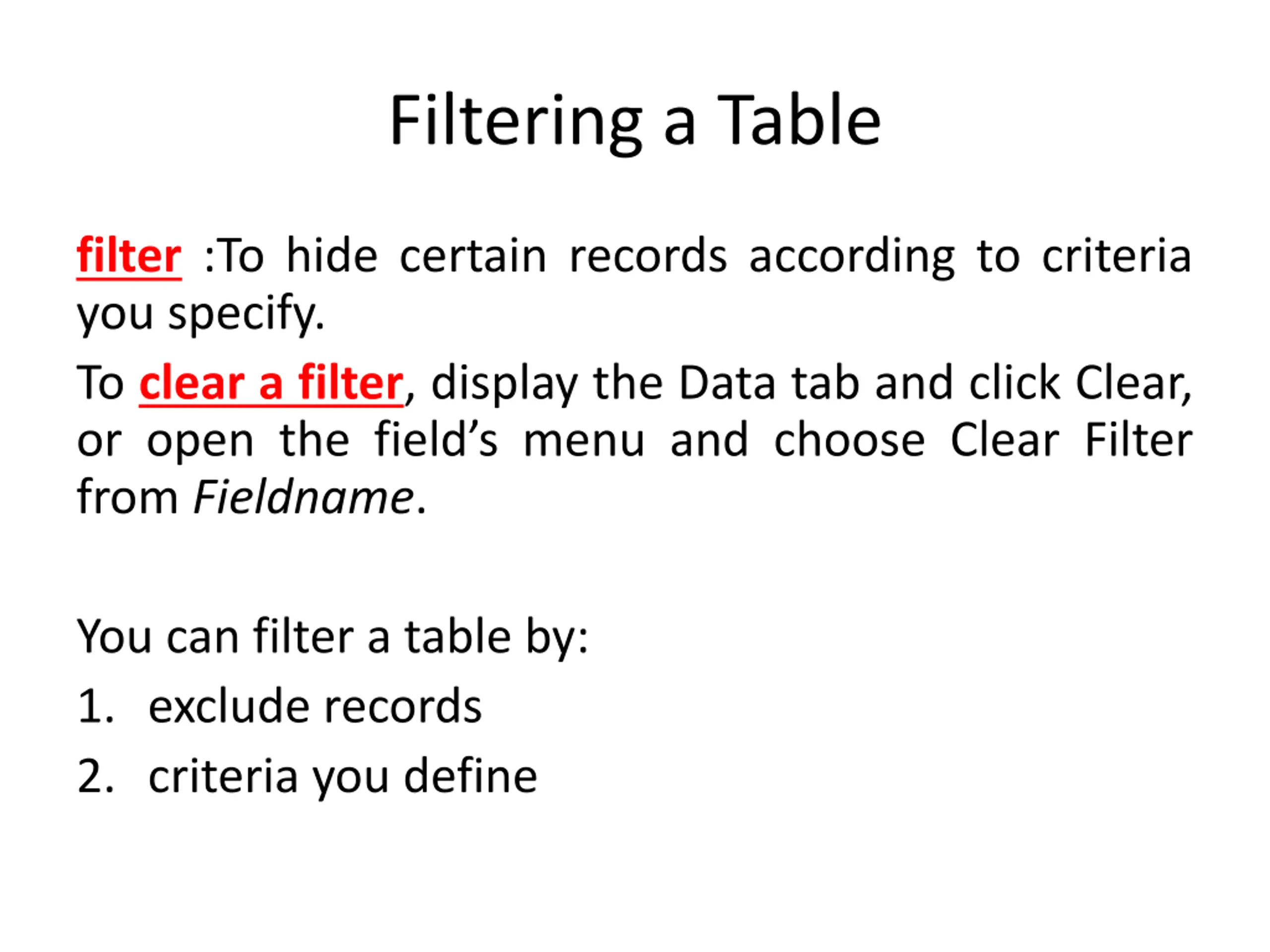 Filtering a Table filter :To hide certain records according to criteria you specify. To clear a filter, display the Data tab and click Clear, or open the field s menu and choose Clear Filter from Fieldname. You can filter a table by: 1. exclude records 2. criteria you define
