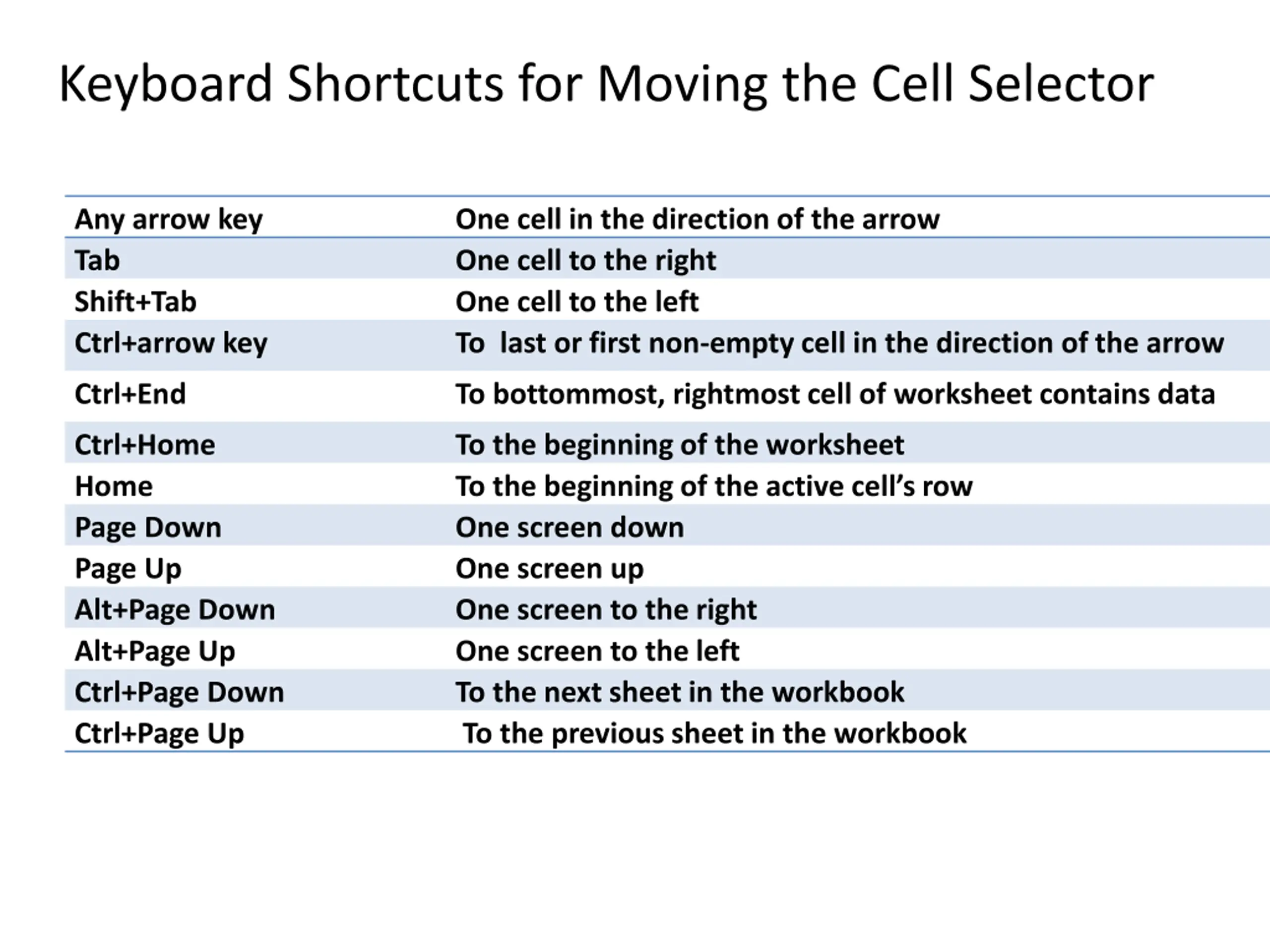 Keyboard Shortcuts for Moving the Cell Selector Any arrow key Tab Shift+Tab Ctrl+arrow key One cell in the direction of the arrow One cell to the right One cell to the left To last or first non-empty cell in the direction of the arrow Ctrl+End To bottommost, rightmost cell of worksheet contains data Ctrl+Home Home Page Down Page Up Alt+Page Down Alt+Page Up Ctrl+Page Down Ctrl+Page Up To the beginning of the worksheet To the beginning of the active cell s row One screen down One screen up One screen to the right One screen to the left To the next sheet in the workbook To the previous sheet in the workbook