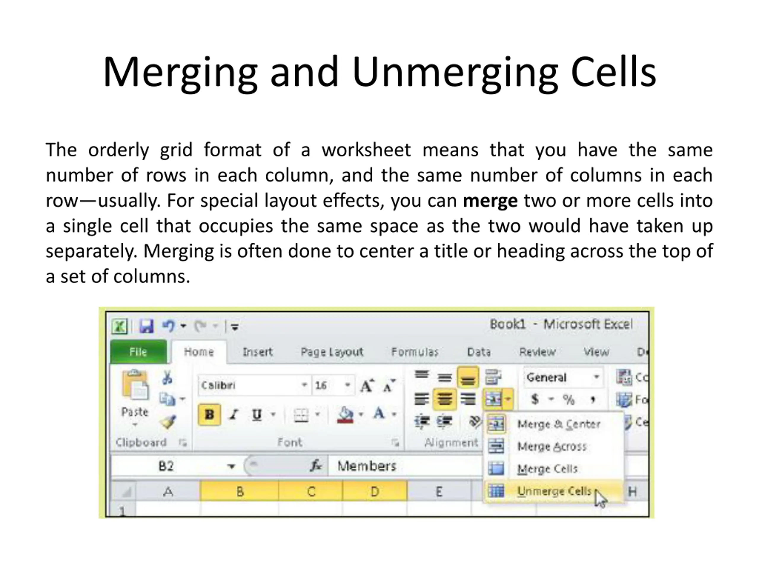 Merging and Unmerging Cells The orderly grid format of a worksheet means that you have the same number of rows in each column, and the same number of columns in each row usually. For special layout effects, you can merge two or more cells into a single cell that occupies the same space as the two would have taken up separately. Merging is often done to center a title or heading across the top of a set of columns.