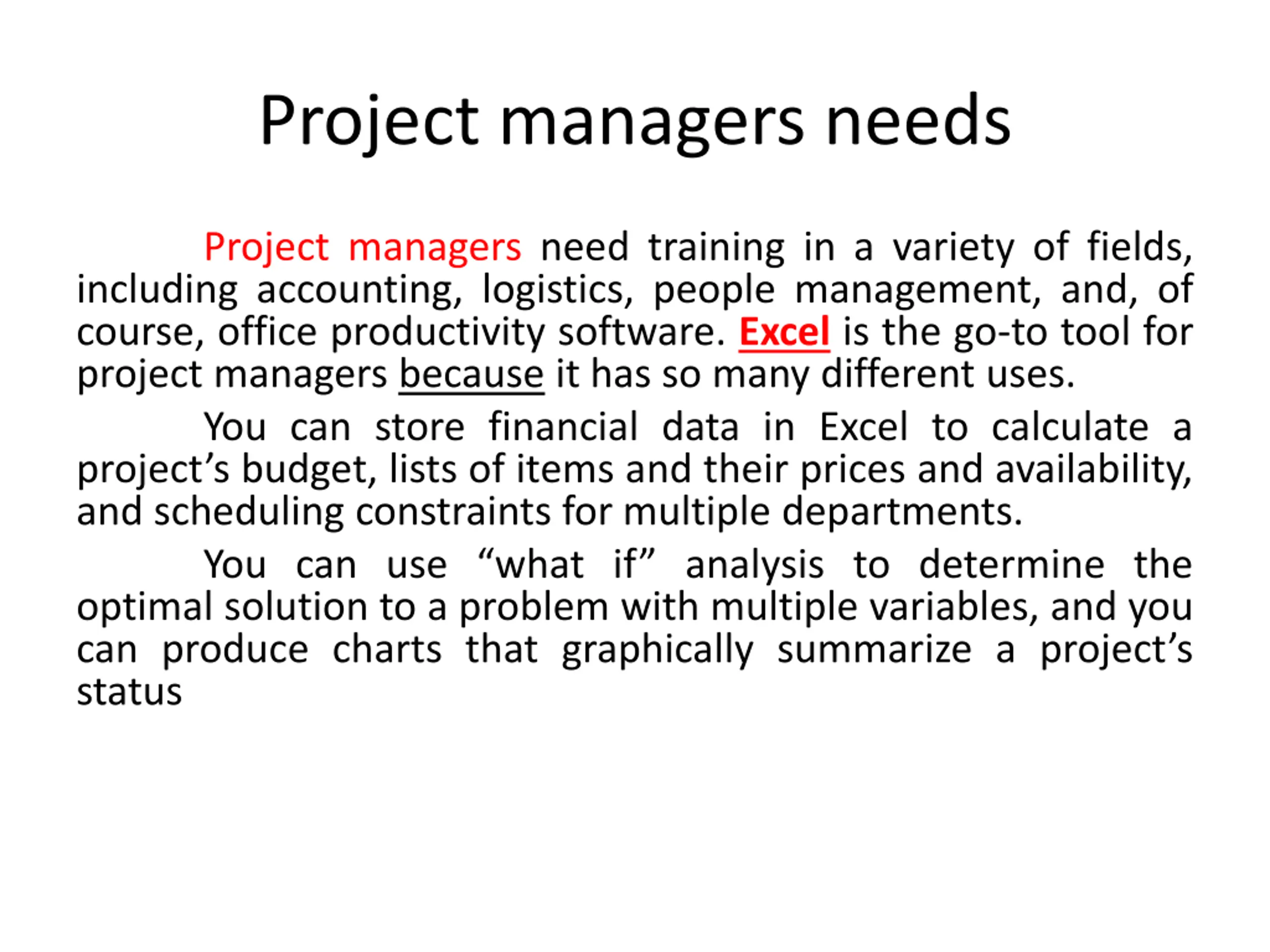 Project managers needs Project managers need training in a variety of fields, including accounting, logistics, people management, and, of course, office productivity software. Excel is the go-to tool for project managers because it has so many different uses. You can store financial data in Excel to calculate a project s budget, lists of items and their prices and availability, and scheduling constraints for multiple departments. You can use what if analysis to determine the optimal solution to a problem with multiple variables, and you can produce charts that graphically summarize a project s status