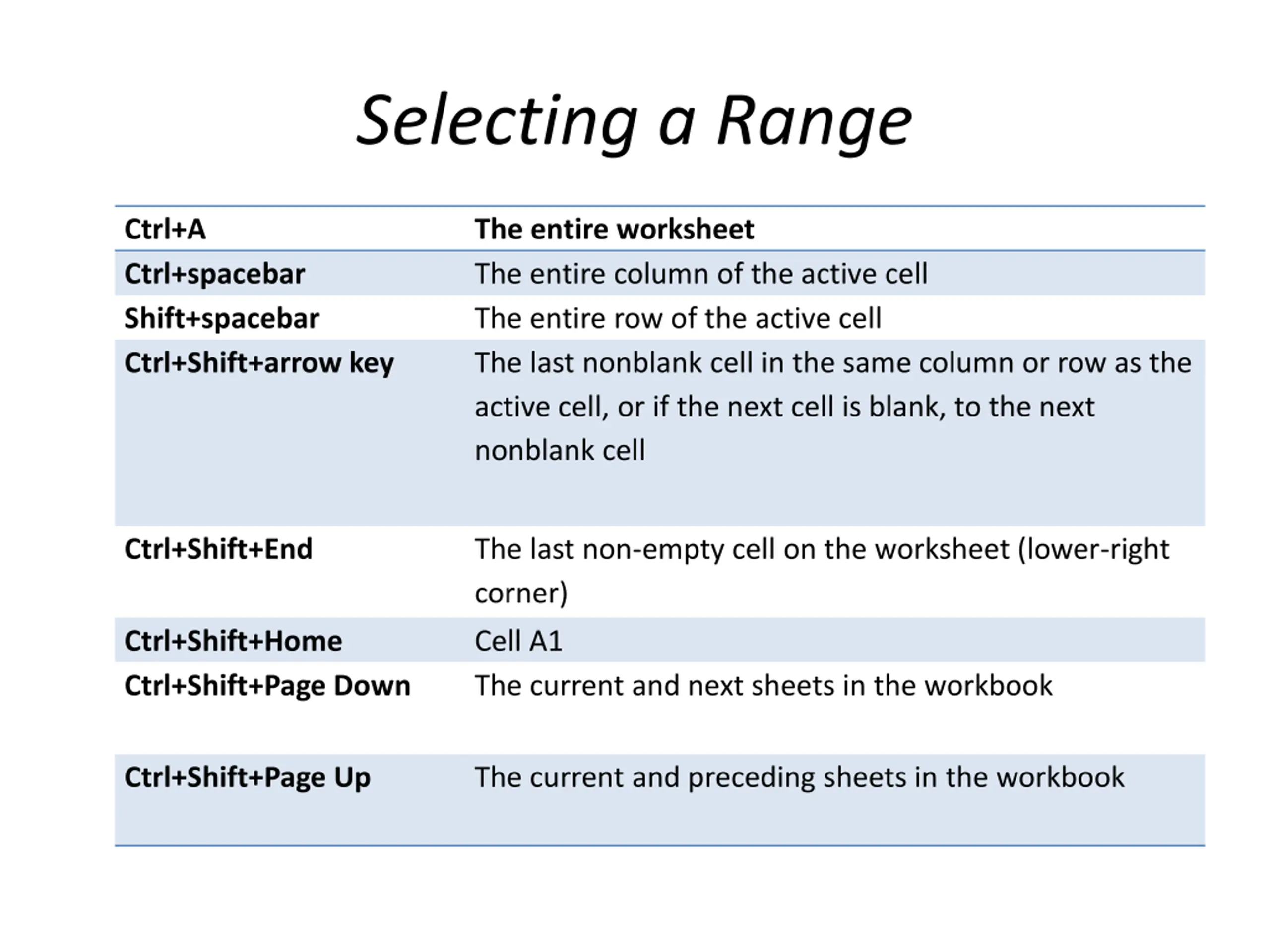 Selecting a Range Ctrl+A Ctrl+spacebar Shift+spacebar Ctrl+Shift+arrow key The entire worksheet The entire column of the active cell The entire row of the active cell The last nonblank cell in the same column or row as the active cell, or if the next cell is blank, to the next nonblank cell Ctrl+Shift+End The last non-empty cell on the worksheet (lower-right corner) Ctrl+Shift+Home Ctrl+Shift+Page Down Cell A1 The current and next sheets in the workbook Ctrl+Shift+Page Up The current and preceding sheets in the workbook