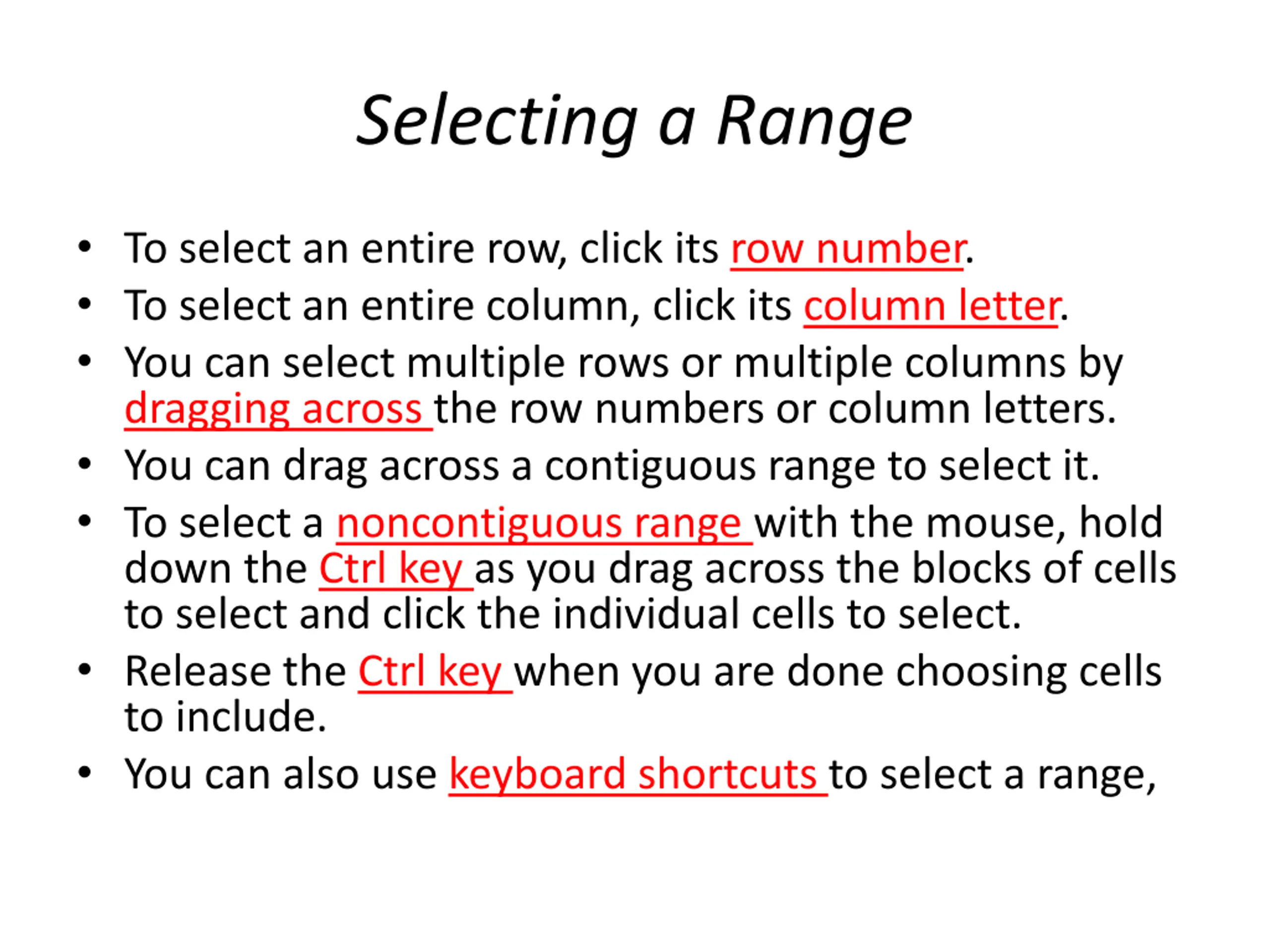 Selecting a Range To select an entire row, click its row number. To select an entire column, click its column letter. You can select multiple rows or multiple columns by dragging across the row numbers or column letters. You can drag across a contiguous range to select it. To select a noncontiguous range with the mouse, hold down the Ctrl key as you drag across the blocks of cells to select and click the individual cells to select. Release the Ctrl key when you are done choosing cells to include. You can also use keyboard shortcuts to select a range,
