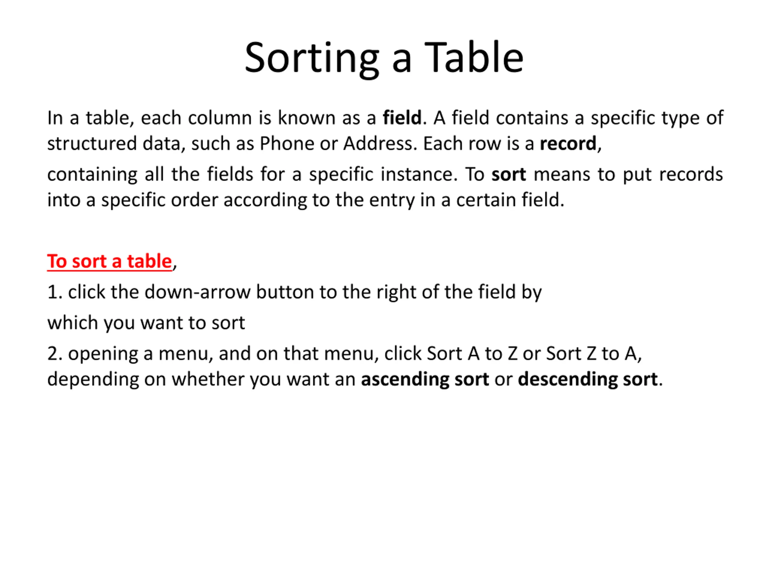 Sorting a Table In a table, each column is known as a field. A field contains a specific type of structured data, such as Phone or Address. Each row is a record, containing all the fields for a specific instance. To sort means to put records into a specific order according to the entry in a certain field. To sort a table, 1. click the down-arrow button to the right of the field by which you want to sort 2. opening a menu, and on that menu, click Sort A to Z or Sort Z to A, depending on whether you want an ascending sort or descending sort.