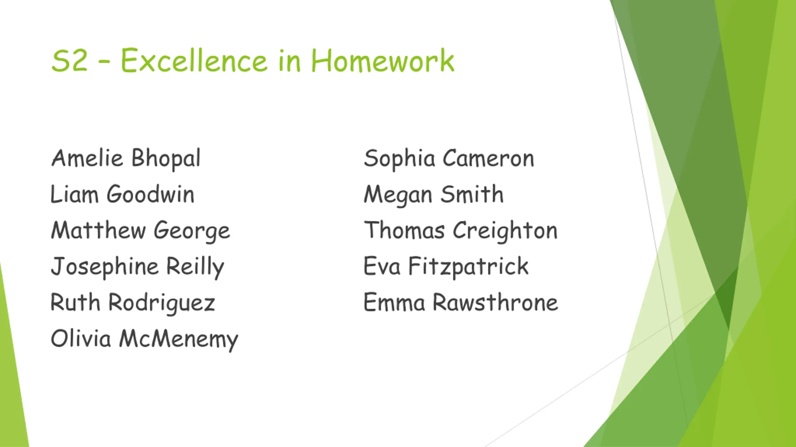 S2 Excellence in Homework Amelie Bhopal Liam Goodwin Matthew George Josephine Reilly Ruth Rodriguez Olivia McMenemy Sophia Cameron Megan Smith Thomas Creighton Eva Fitzpatrick Emma Rawsthrone