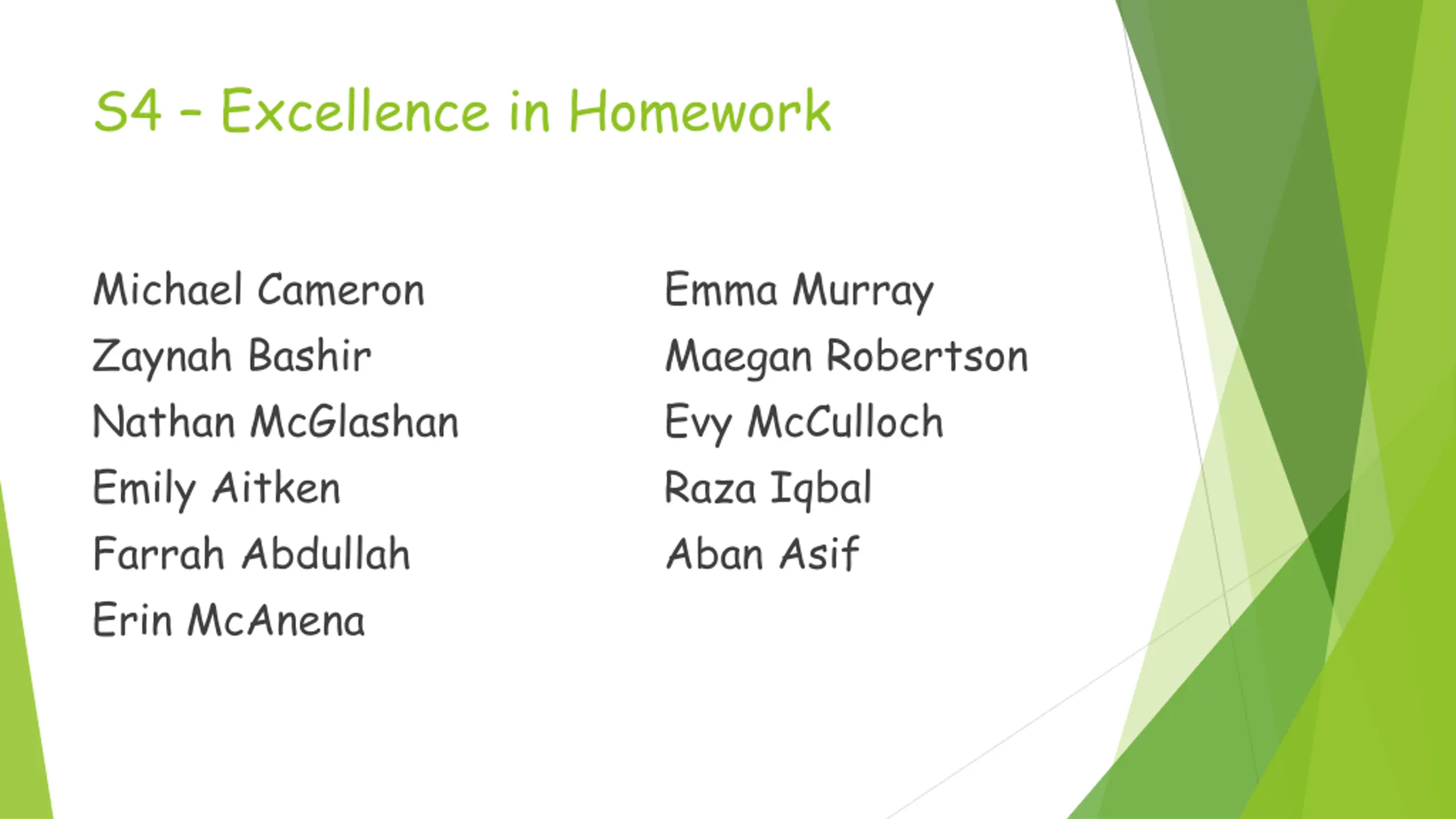 S4 Excellence in Homework Michael Cameron Zaynah Bashir Nathan McGlashan Emily Aitken Farrah Abdullah Erin McAnena Emma Murray Maegan Robertson Evy McCulloch Raza Iqbal Aban Asif