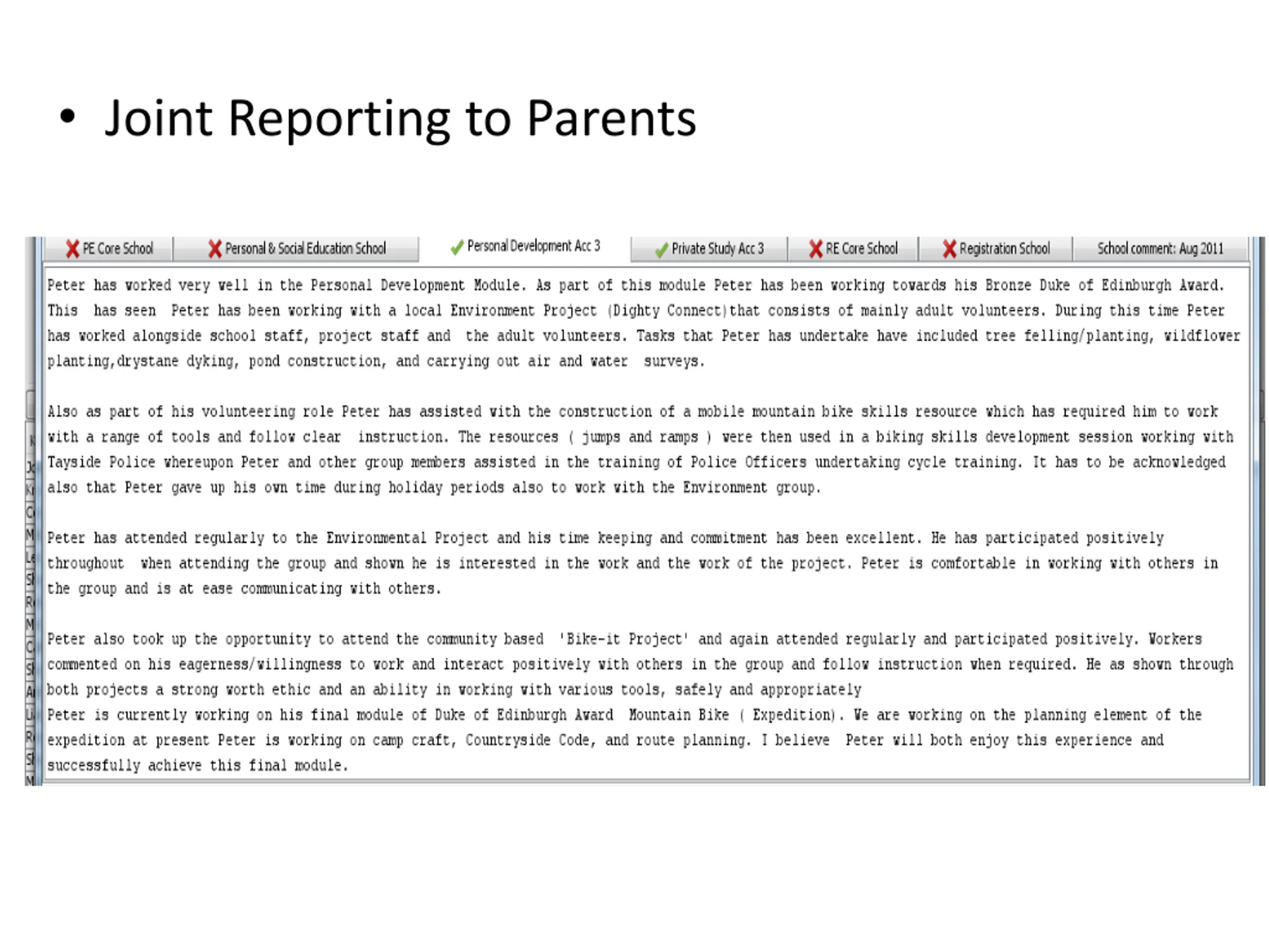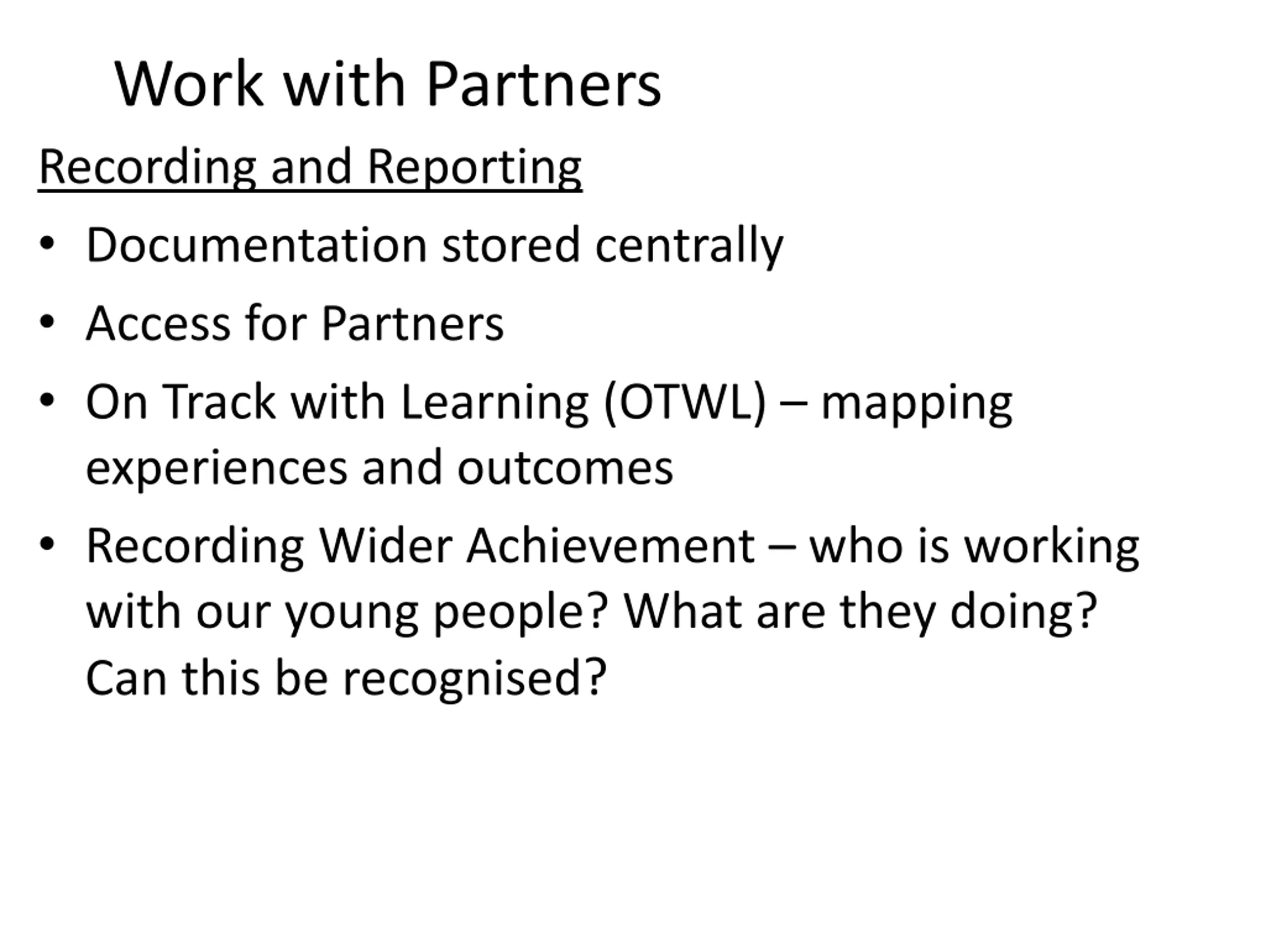 Work with Partners Recording and Reporting Documentation stored centrally Access for Partners On Track with Learning (OTWL) mapping experiences and outcomes Recording Wider Achievement who is working with our young people? What are they doing? Can this be recognised?