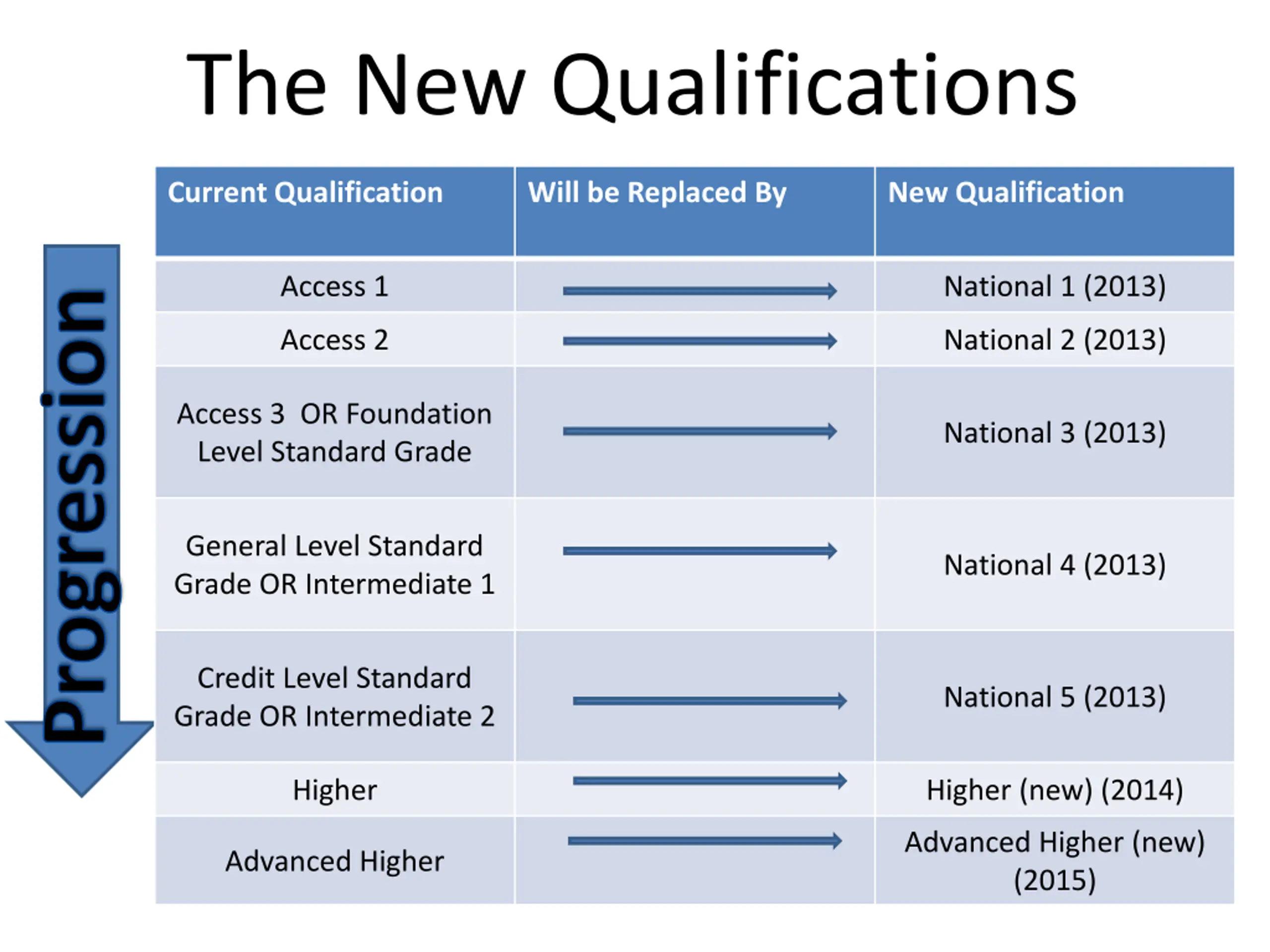 The New Qualifications Current Qualification Will be Replaced By New Qualification Access 1 National 1 (2013) Progression Access 2 National 2 (2013) Access 3 OR Foundation Level Standard Grade National 3 (2013) General Level Standard Grade OR Intermediate 1 National 4 (2013) Credit Level Standard Grade OR Intermediate 2 National 5 (2013) Higher Higher (new) (2014) Advanced Higher (new) (2015) Advanced Higher