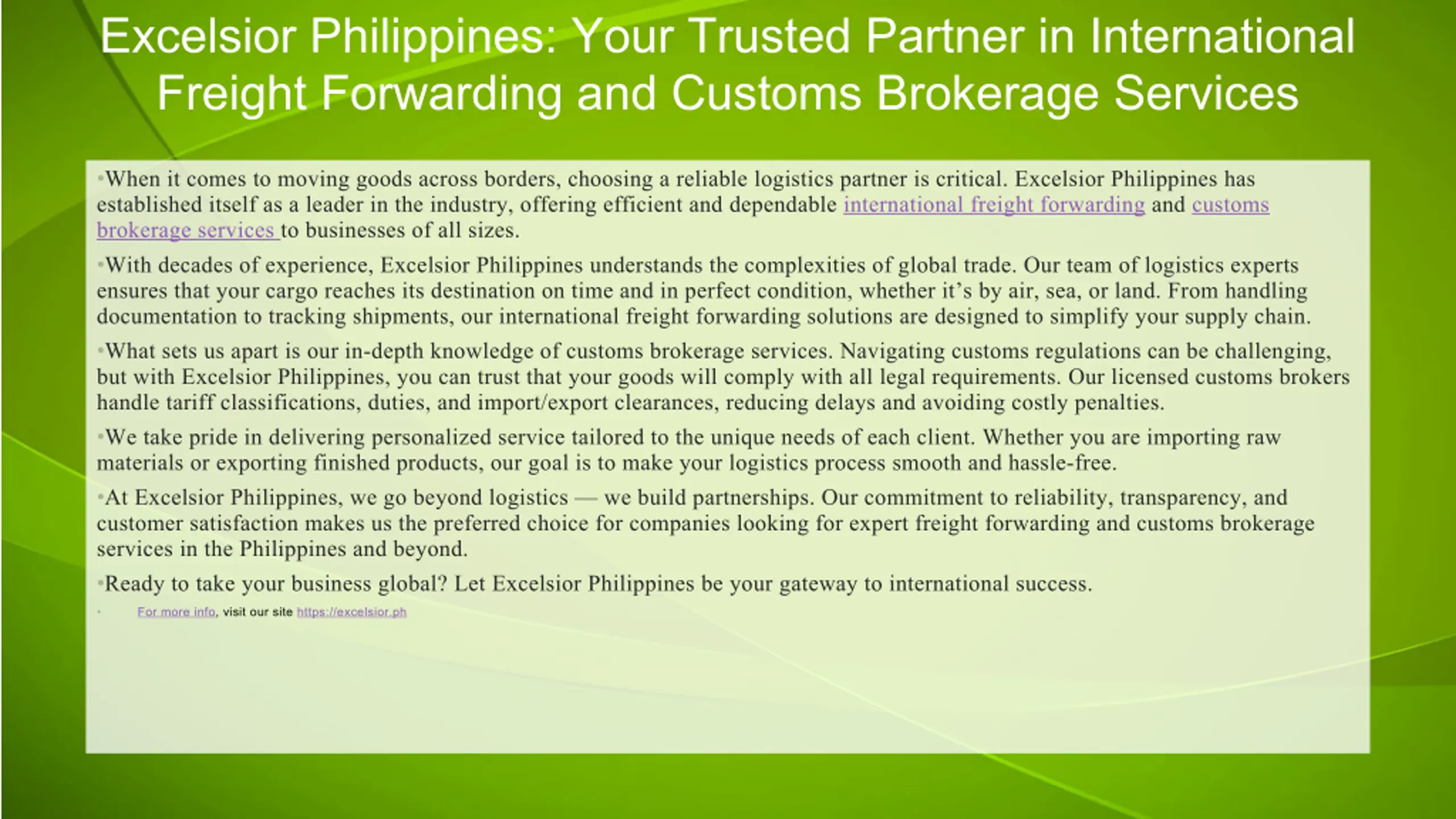 Excelsior Philippines has established itself as a leader in the industry, offering efficient and dependable international freight forwarding and customs brokerage services to businesses of all sizes.nnFor more info, visit our site //excelsior.ph