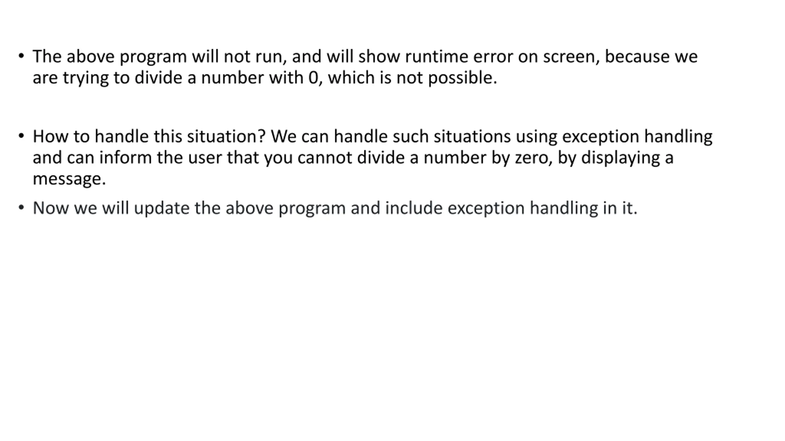 The above program will not run, and will show runtime error on screen, because we are trying to divide a number with 0, which is not possible. How to handle this situation? We can handle such situations using exception handling and can inform the user that you cannot divide a number by zero, by displaying a message. Now we will update the above program and include exception handling in it.