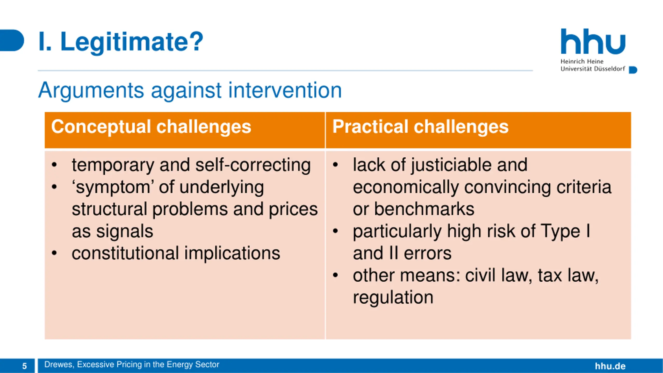 I. Legitimate? Arguments against intervention Conceptual challenges Practical challenges temporary and self-correcting symptom of underlying structural problems and prices as signals constitutional implications lack of justiciable and economically convincing criteria or benchmarks particularly high risk of Type I and II errors other means: civil law, tax law, regulation Drewes, Excessive Pricing in the Energy Sector hhu.de 5