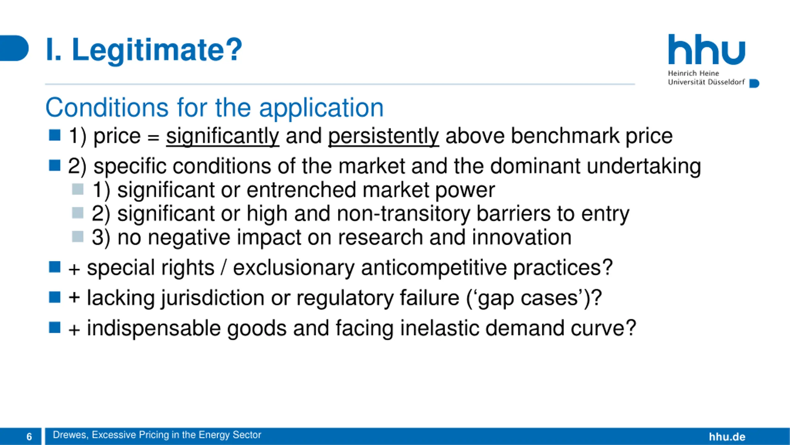 I. Legitimate? Conditions for the application 1) price = significantly and persistently above benchmark price 2) specific conditions of the market and the dominant undertaking 1) significant or entrenched market power 2) significant or high and non-transitory barriers to entry 3) no negative impact on research and innovation + special rights / exclusionary anticompetitive practices? + lacking jurisdiction or regulatory failure ( gap cases )? + indispensable goods and facing inelastic demand curve? Drewes, Excessive Pricing in the Energy Sector hhu.de 6