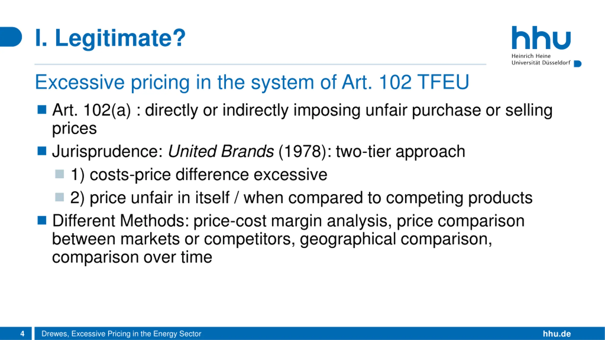 I. Legitimate? Excessive pricing in the system of Art. 102 TFEU Art. 102(a) : directly or indirectly imposing unfair purchase or selling prices Jurisprudence: United Brands (1978): two-tier approach 1) costs-price difference excessive 2) price unfair in itself / when compared to competing products Different Methods: price-cost margin analysis, price comparison between markets or competitors, geographical comparison, comparison over time hhu.de Drewes, Excessive Pricing in the Energy Sector 4