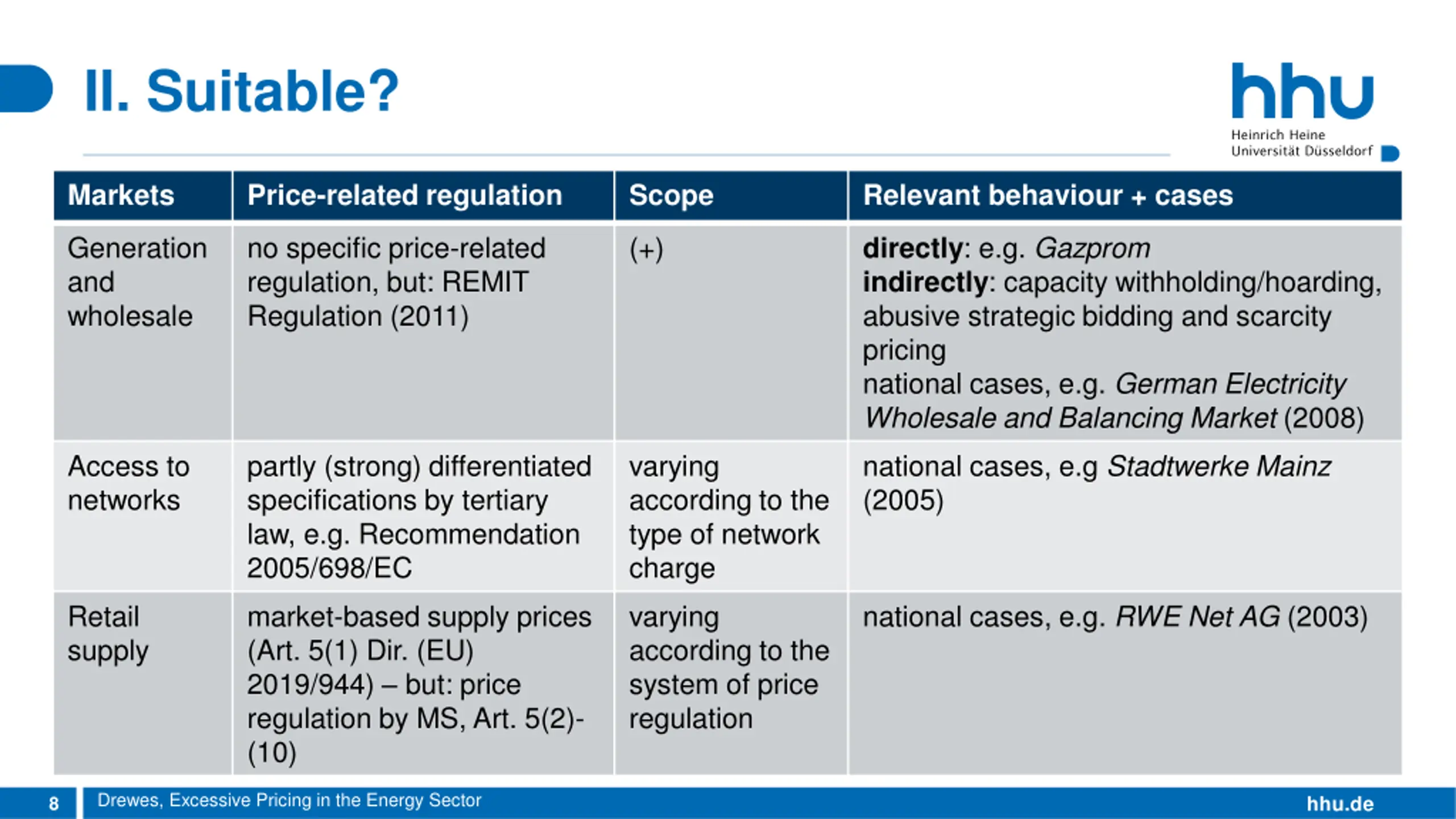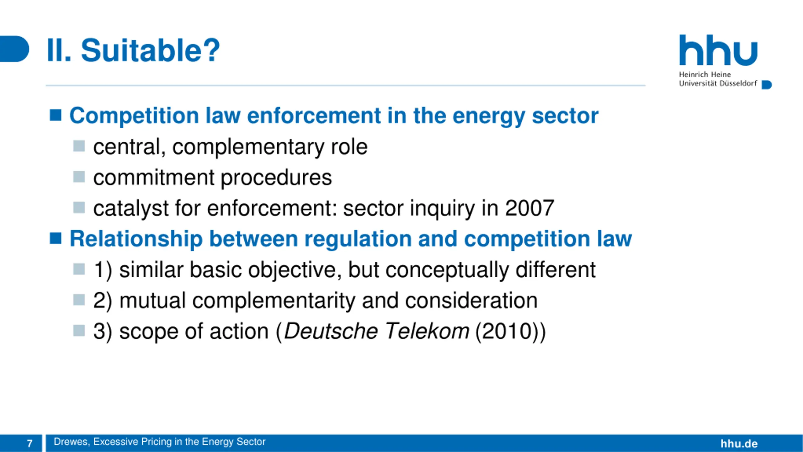 II. Suitable? Competition law enforcement in the energy sector central, complementary role commitment procedures catalyst for enforcement: sector inquiry in 2007 Relationship between regulation and competition law 1) similar basic objective, but conceptually different 2) mutual complementarity and consideration 3) scope of action (Deutsche Telekom (2010)) Drewes, Excessive Pricing in the Energy Sector hhu.de 7