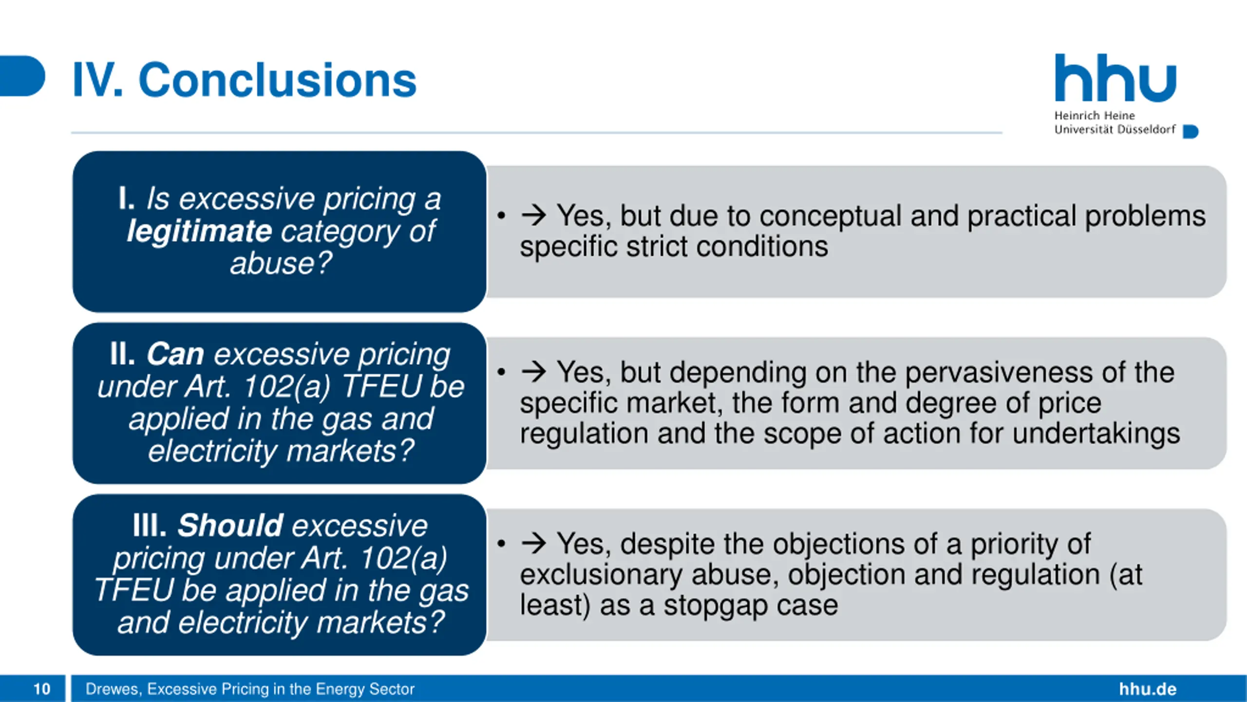 IV. Conclusions I. Is excessive pricing a legitimate category of abuse? Yes, but due to conceptual and practical problems specific strict conditions II. Can excessive pricing under Art. 102(a) TFEU be applied in the gas and electricity markets? Yes, but depending on the pervasiveness of the specific market, the form and degree of price regulation and the scope of action for undertakings III. Should excessive pricing under Art. 102(a) TFEU be applied in the gas and electricity markets? Yes, despite the objections of a priority of exclusionary abuse, objection and regulation (at least) as a stopgap case hhu.de Drewes, Excessive Pricing in the Energy Sector 10