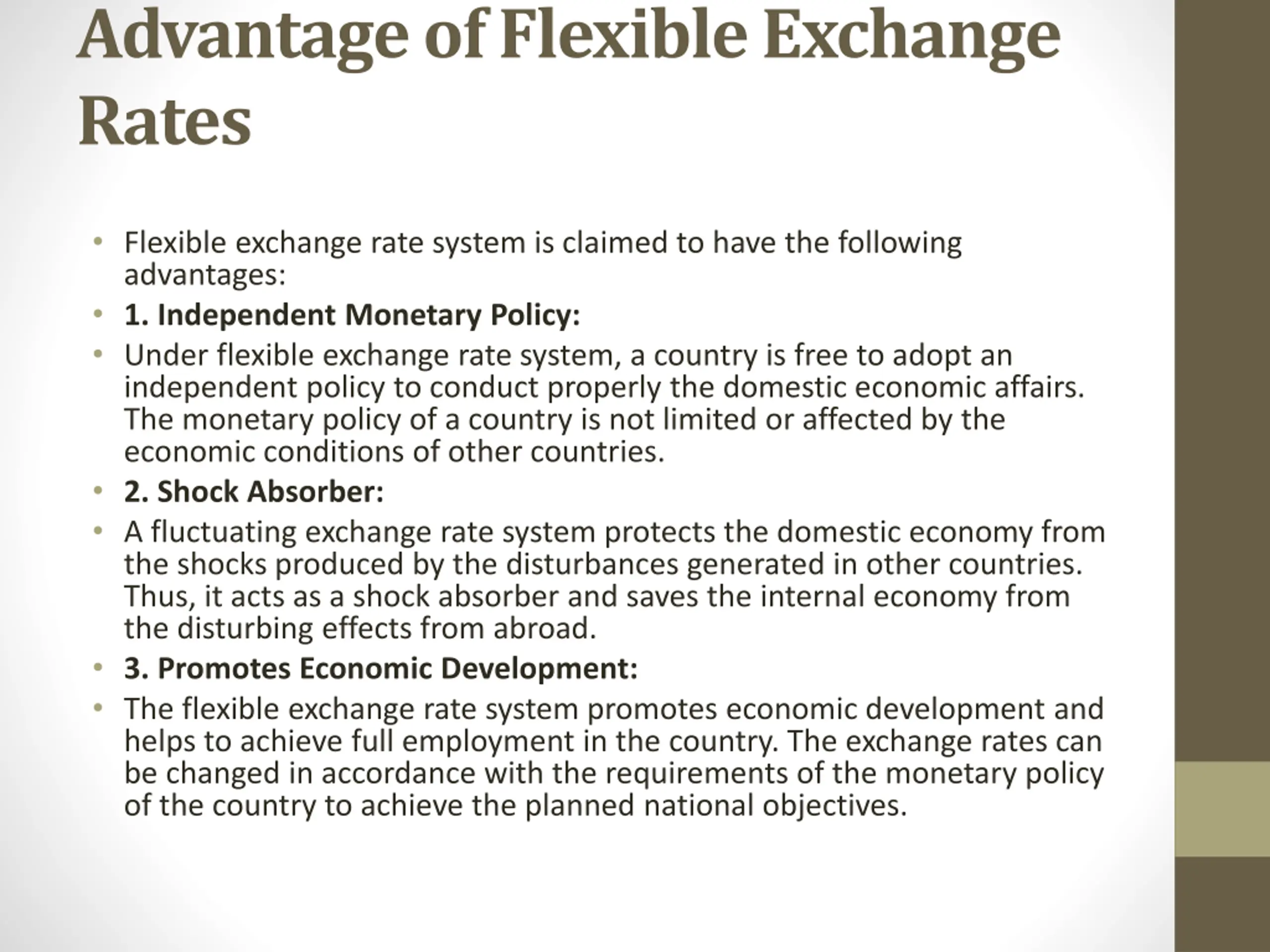 Advantage of Flexible Exchange Rates Flexible exchange rate system is claimed to have the following advantages: 1. Independent Monetary Policy: Under flexible exchange rate system, a country is free to adopt an independent policy to conduct properly the domestic economic affairs. The monetary policy of a country is not limited or affected by the economic conditions of other countries. 2. Shock Absorber: A fluctuating exchange rate system protects the domestic economy from the shocks produced by the disturbances generated in other countries. Thus, it acts as a shock absorber and saves the internal economy from the disturbing effects from abroad. 3. Promotes Economic Development: The flexible exchange rate system promotes economic development and helps to achieve full employment in the country. The exchange rates can be changed in accordance with the requirements of the monetary policy of the country to achieve the planned national objectives.