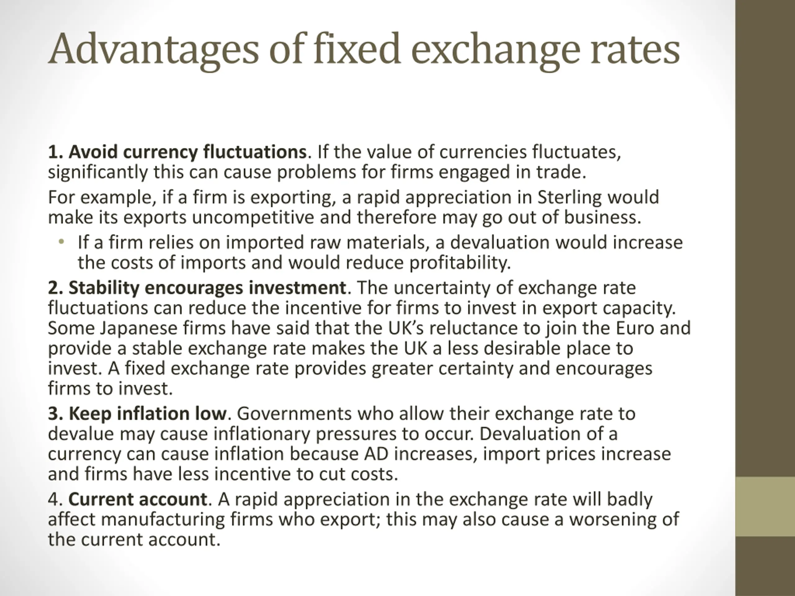 Advantages of fixed exchange rates 1. Avoid currency fluctuations. If the value of currencies fluctuates, significantly this can cause problems for firms engaged in trade. For example, if a firm is exporting, a rapid appreciation in Sterling would make its exports uncompetitive and therefore may go out of business. If a firm relies on imported raw materials, a devaluation would increase the costs of imports and would reduce profitability. 2. Stability encourages investment. The uncertainty of exchange rate fluctuations can reduce the incentive for firms to invest in export capacity. Some Japanese firms have said that the UK s reluctance to join the Euro and provide a stable exchange rate makes the UK a less desirable place to invest. A fixed exchange rate provides greater certainty and encourages firms to invest. 3. Keep inflation low. Governments who allow their exchange rate to devalue may cause inflationary pressures to occur. Devaluation of a currency can cause inflation because AD increases, import prices increase and firms have less incentive to cut costs. 4. Current account. A rapid appreciation in the exchange rate will badly affect manufacturing firms who export; this may also cause a worsening of the current account.