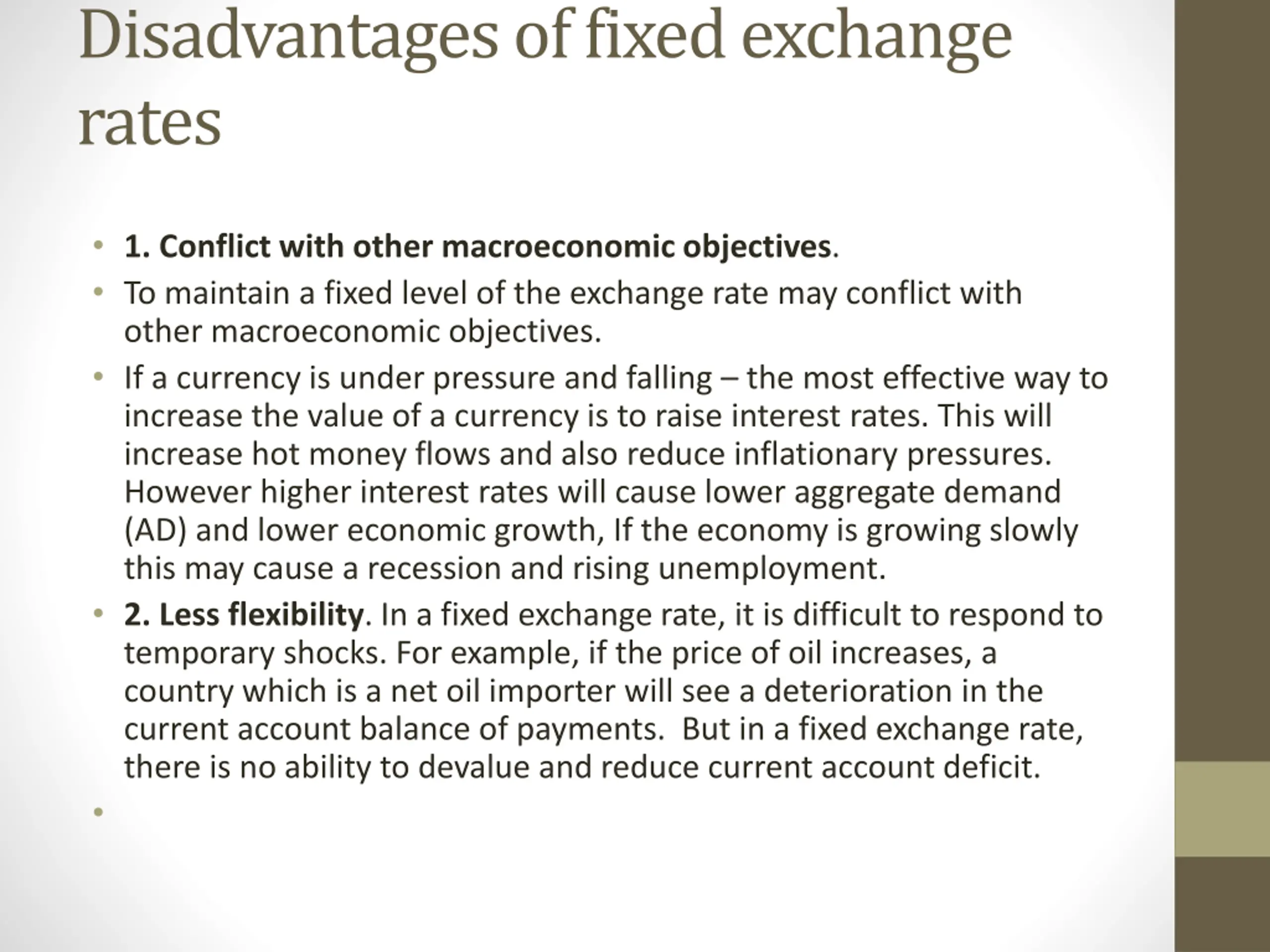 Disadvantages of fixed exchange rates 1. Conflict with other macroeconomic objectives. To maintain a fixed level of the exchange rate may conflict with other macroeconomic objectives. If a currency is under pressure and falling the most effective way to increase the value of a currency is to raise interest rates. This will increase hot money flows and also reduce inflationary pressures. However higher interest rates will cause lower aggregate demand (AD) and lower economic growth, If the economy is growing slowly this may cause a recession and rising unemployment. 2. Less flexibility. In a fixed exchange rate, it is difficult to respond to temporary shocks. For example, if the price of oil increases, a country which is a net oil importer will see a deterioration in the current account balance of payments. But in a fixed exchange rate, there is no ability to devalue and reduce current account deficit.