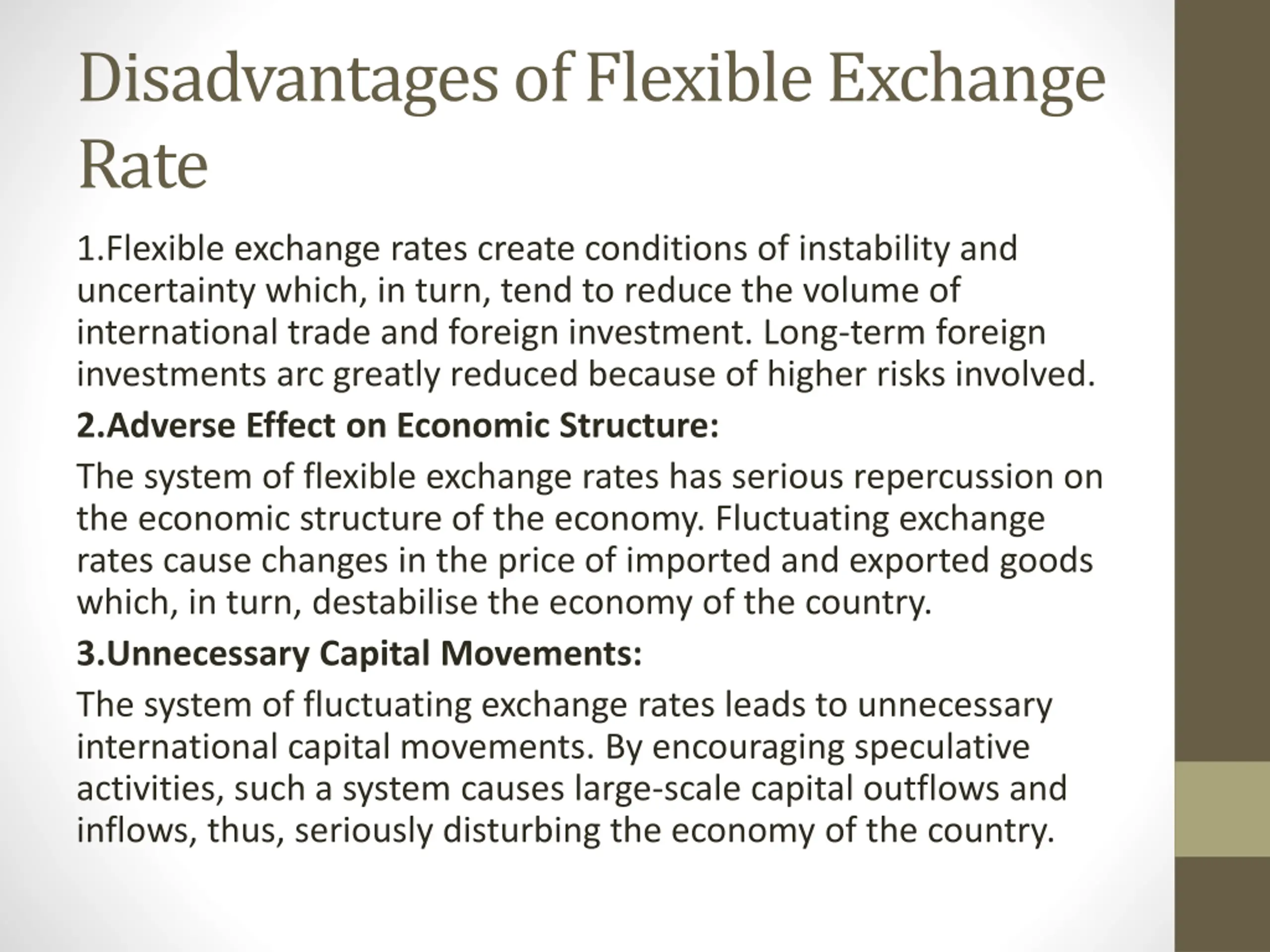Disadvantages of Flexible Exchange Rate 1.Flexible exchange rates create conditions of instability and uncertainty which, in turn, tend to reduce the volume of international trade and foreign investment. Long-term foreign investments arc greatly reduced because of higher risks involved. 2.Adverse Effect on Economic Structure: The system of flexible exchange rates has serious repercussion on the economic structure of the economy. Fluctuating exchange rates cause changes in the price of imported and exported goods which, in turn, destabilise the economy of the country. 3.Unnecessary Capital Movements: The system of fluctuating exchange rates leads to unnecessary international capital movements. By encouraging speculative activities, such a system causes large-scale capital outflows and inflows, thus, seriously disturbing the economy of the country.