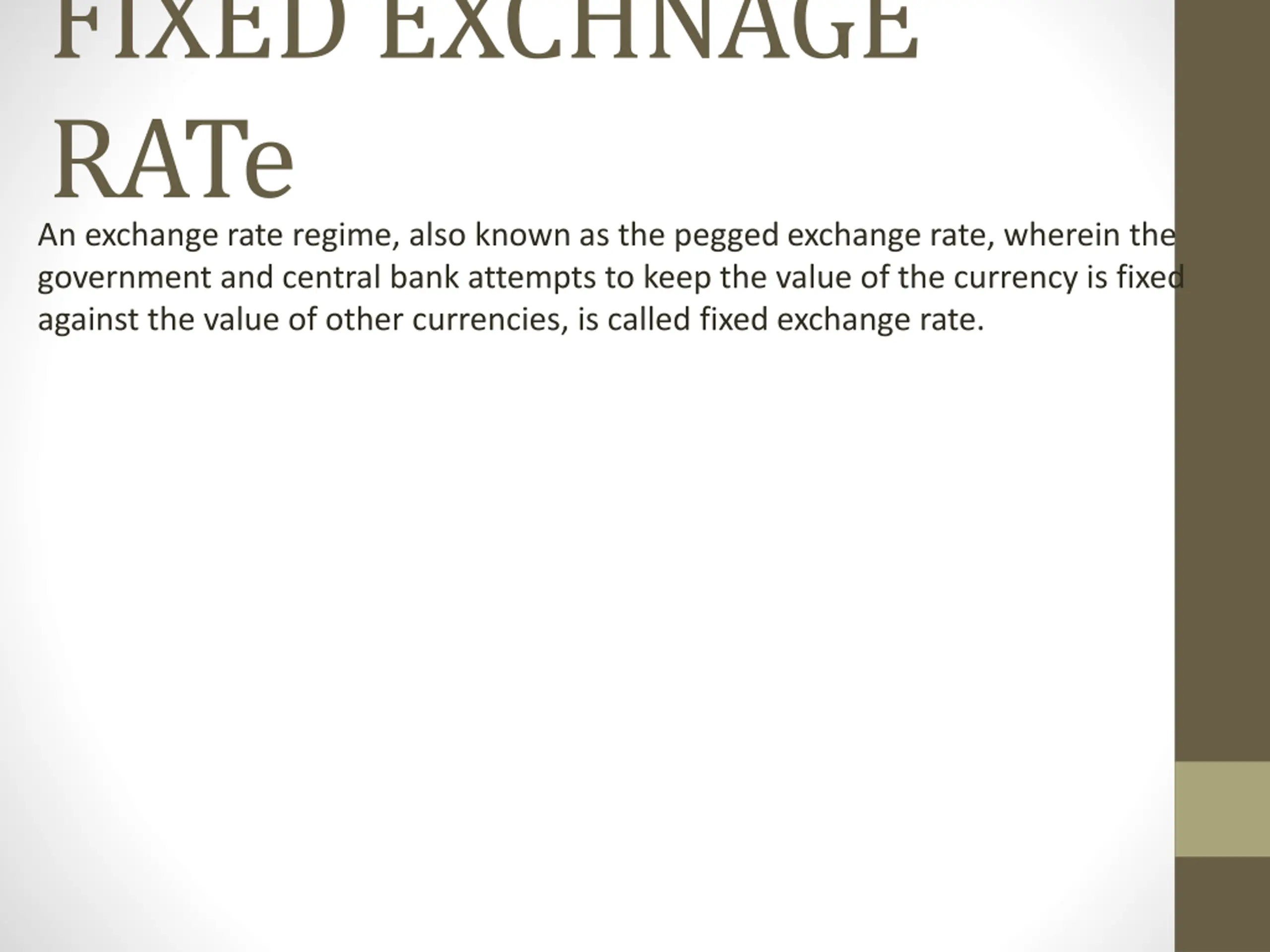 FIXED EXCHNAGE RATe An exchange rate regime, also known as the pegged exchange rate, wherein the government and central bank attempts to keep the value of the currency is fixed against the value of other currencies, is called fixed exchange rate.
