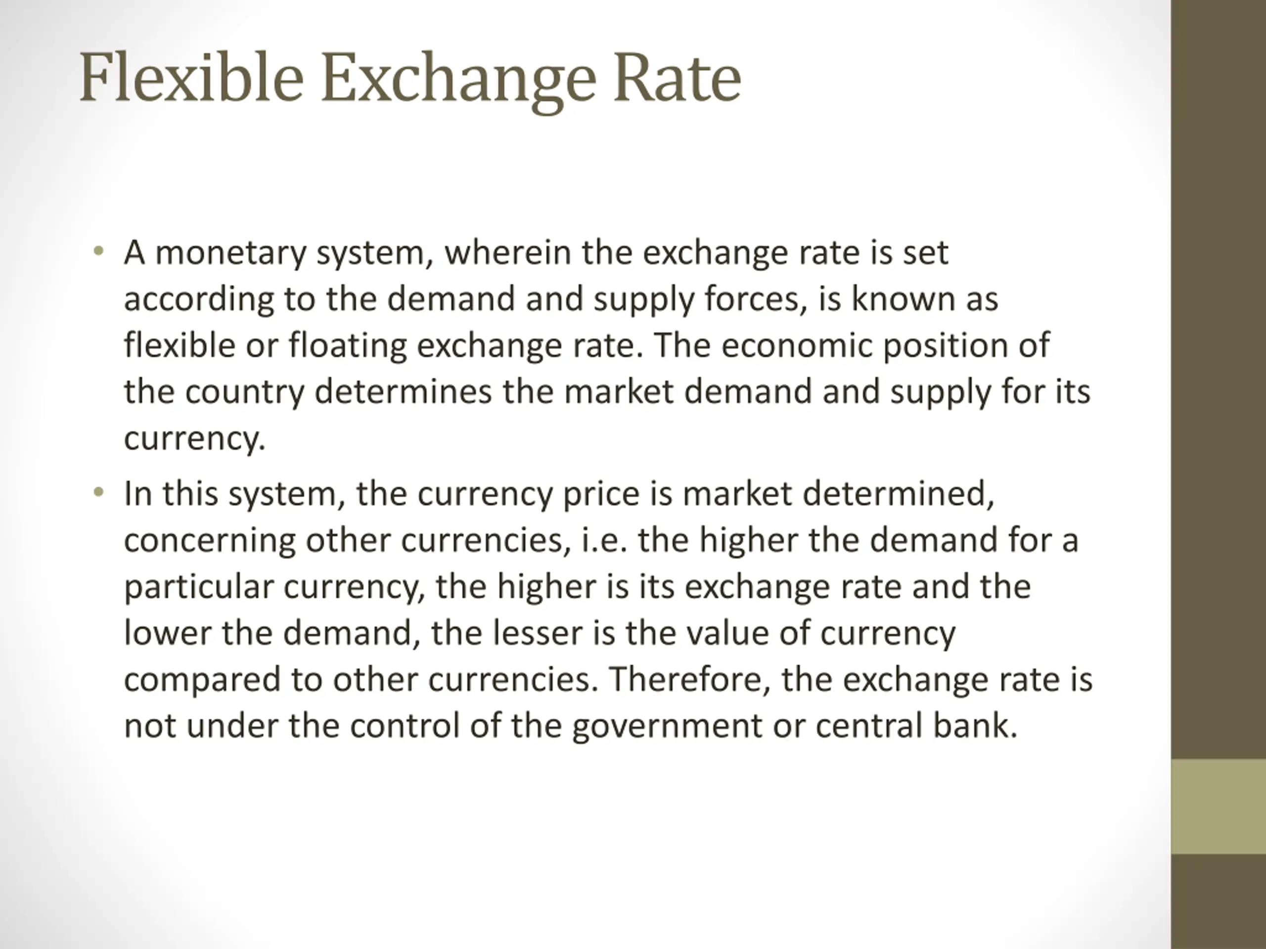 Flexible Exchange Rate A monetary system, wherein the exchange rate is set according to the demand and supply forces, is known as flexible or floating exchange rate. The economic position of the country determines the market demand and supply for its currency. In this system, the currency price is market determined, concerning other currencies, i.e. the higher the demand for a particular currency, the higher is its exchange rate and the lower the demand, the lesser is the value of currency compared to other currencies. Therefore, the exchange rate is not under the control of the government or central bank.