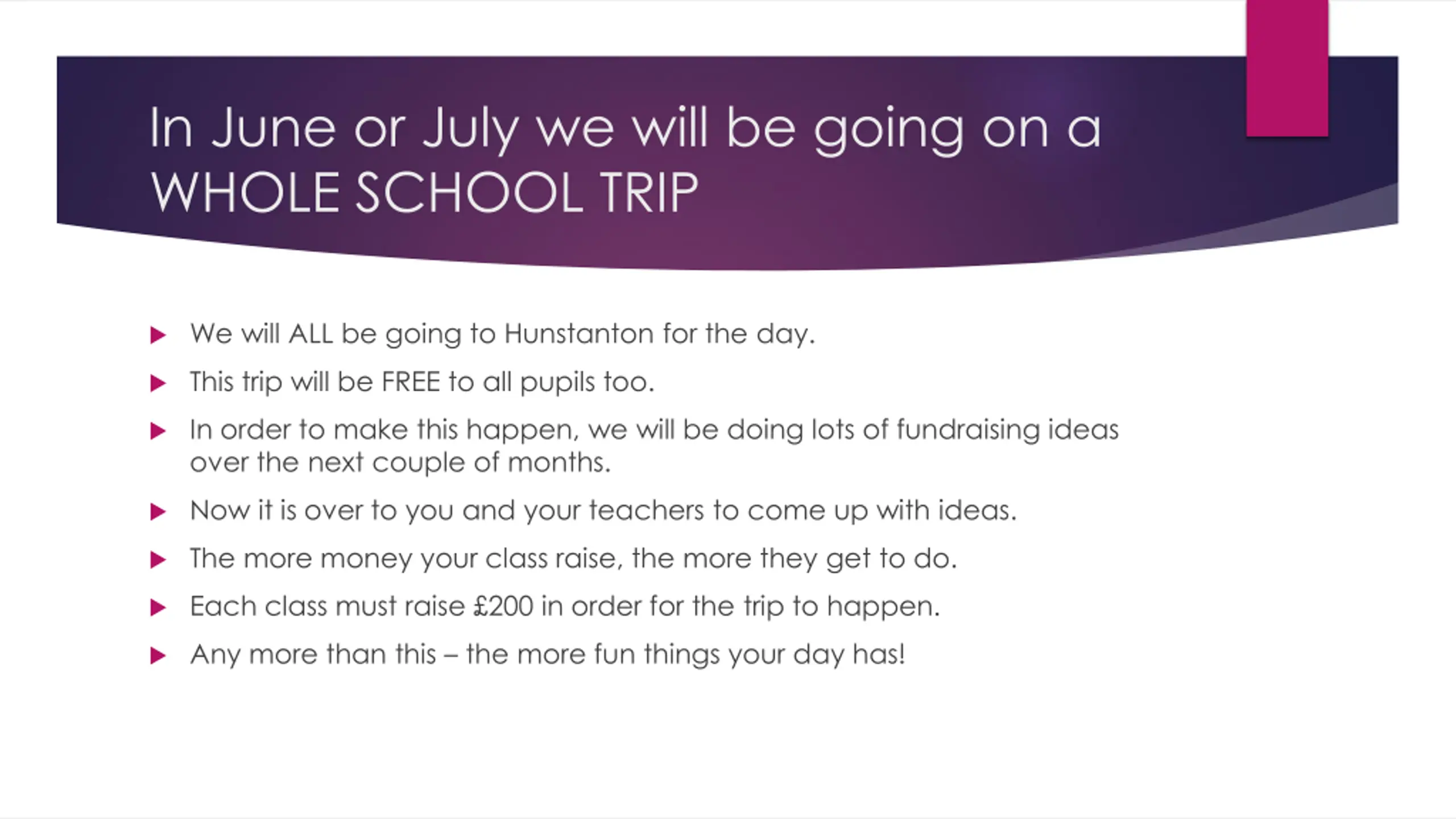 In June or July we will be going on a WHOLE SCHOOL TRIP We will ALL be going to Hunstanton for the day. This trip will be FREE to all pupils too. In order to make this happen, we will be doing lots of fundraising ideas over the next couple of months. Now it is over to you and your teachers to come up with ideas. The more money your class raise, the more they get to do. Each class must raise 200 in order for the trip to happen. Any more than this the more fun things your day has!