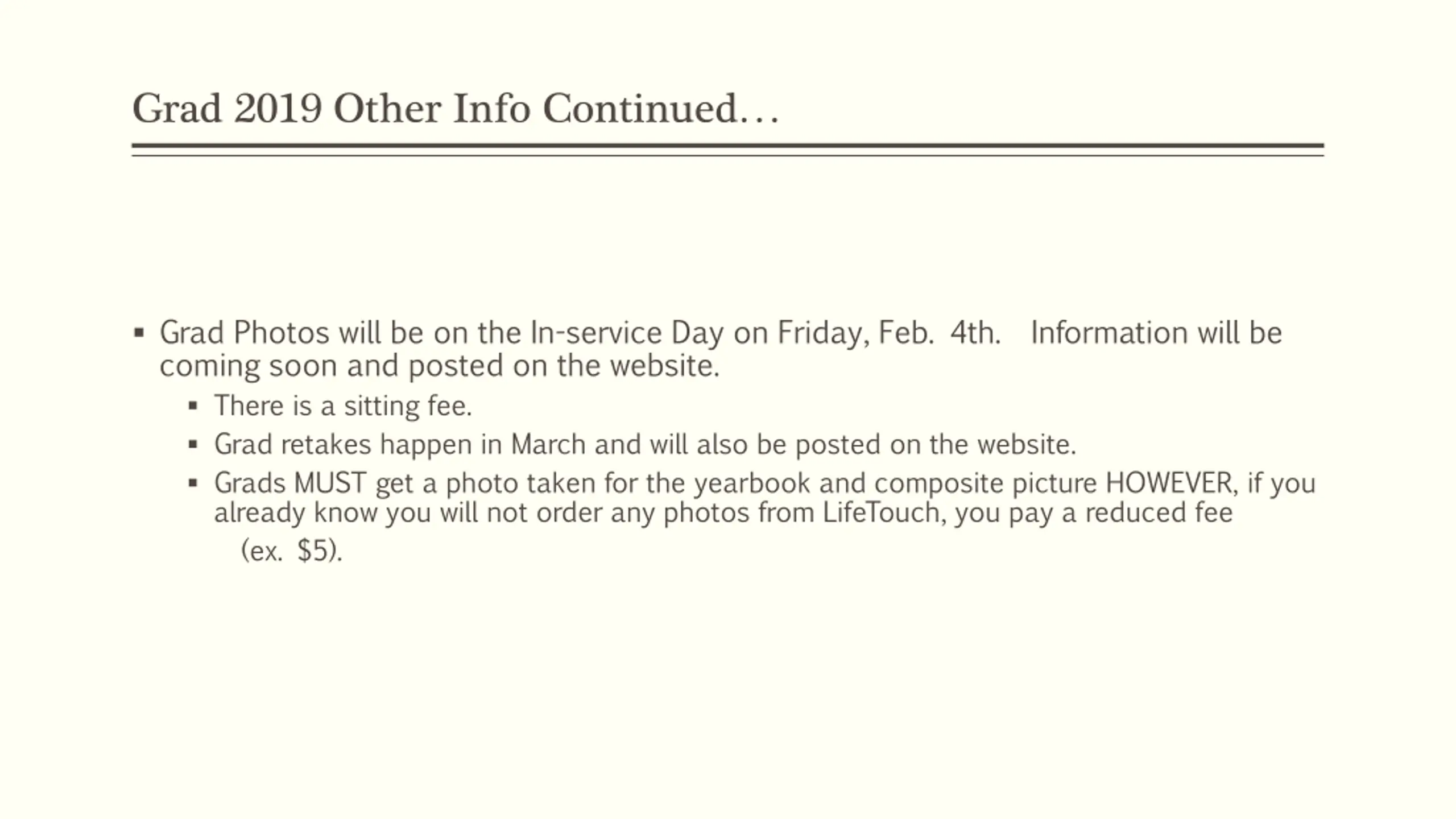 Grad 2019 Other Info Continued Grad Photos will be on the In-service Day on Friday, Feb. 4th. Information will be coming soon and posted on the website. There is a sitting fee. Grad retakes happen in March and will also be posted on the website. Grads MUST get a photo taken for the yearbook and composite picture HOWEVER, if you already know you will not order any photos from LifeTouch, you pay a reduced fee (ex. $5).