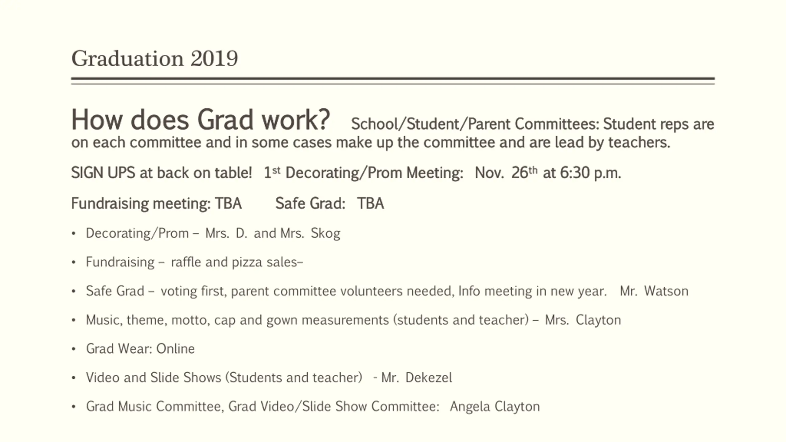 Graduation 2019 How does Grad work? How does Grad work? School/Student/Parent Committees: Student reps are School/Student/Parent Committees: Student reps are on each committee and in some cases make up the committee and are lead by teachers. on each committee and in some cases make up the committee and are lead by teachers. SIGN UPS at back on table! 1 SIGN UPS at back on table! 1st stDecorating/Prom Meeting: Nov. 26 Decorating/Prom Meeting: Nov. 26th that 6:30 p.m. at 6:30 p.m. Fundraising meeting: TBA Safe Grad: TBA Fundraising meeting: TBA Safe Grad: TBA Decorating/Prom Mrs. D. and Mrs. Skog Fundraising raffle and pizza sales Safe Grad voting first, parent committee volunteers needed, Info meeting in new year. Mr. Watson Music, theme, motto, cap and gown measurements (students and teacher) Mrs. Clayton Grad Wear: Online Video and Slide Shows (Students and teacher) - Mr. Dekezel Grad Music Committee, Grad Video/Slide Show Committee: Angela Clayton