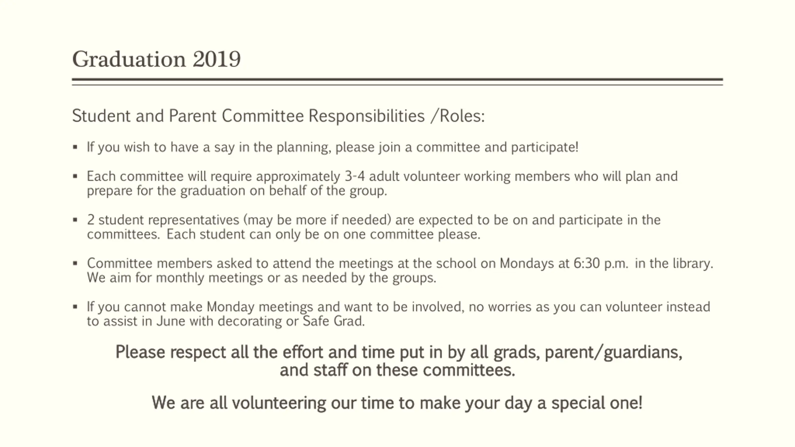Graduation 2019 Student and Parent Committee Responsibilities /Roles: If you wish to have a say in the planning, please join a committee and participate! Each committee will require approximately 3-4 adult volunteer working members who will plan and prepare for the graduation on behalf of the group. 2 student representatives (may be more if needed) are expected to be on and participate in the committees. Each student can only be on one committee please. Committee members asked to attend the meetings at the school on Mondays at 6:30 p.m. in the library. We aim for monthly meetings or as needed by the groups. If you cannot make Monday meetings and want to be involved, no worries as you can volunteer instead to assist in June with decorating or Safe Grad. Please respect all the effort and time put in by all Please respect all the effort and time put in by all grads, parent/guardians, and staff on and staff on these these committees. committees. grads, parent/guardians, We are all volunteering our time to make your day a special one! We are all volunteering our time to make your day a special one!
