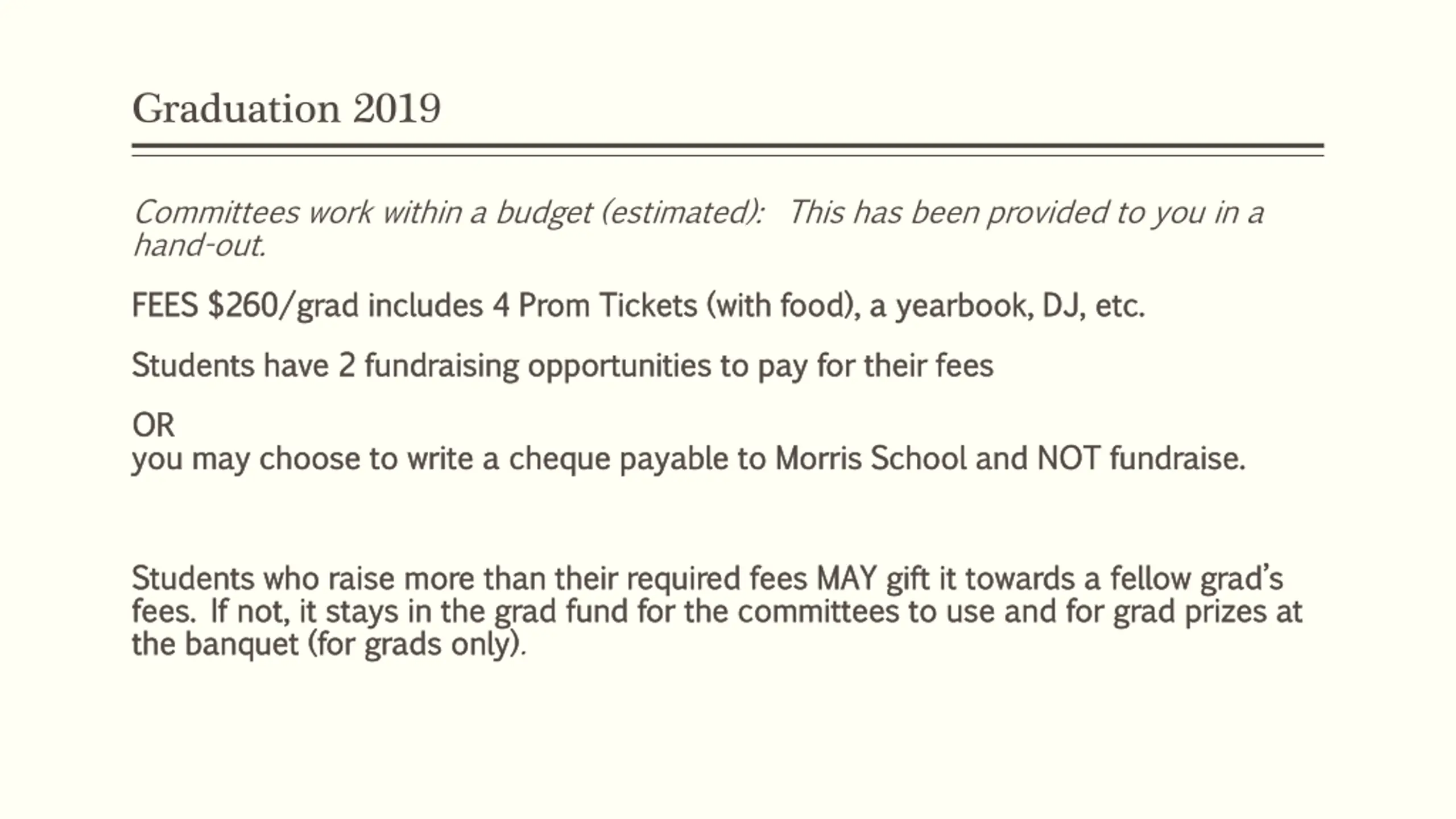 Graduation 2019 Committees work within a budget (estimated): This has been provided to you in a hand-out. FEES $260/grad includes 4 Prom Tickets ( FEES $260/grad includes 4 Prom Tickets (with food), with food), a yearbook a yearbook, DJ, etc. , DJ, etc. Students have 2 fundraising opportunities to pay for their fees Students have 2 fundraising opportunities to pay for their fees OR OR you may choose to write a cheque payable to Morris School and NOT fundraise. you may choose to write a cheque payable to Morris School and NOT fundraise. Students who raise more than their required fees MAY gift it towards a fellow grad s Students who raise more than their required fees MAY gift it towards a fellow grad s fees. If not, it stays in the grad fund for the committees to use and for grad prizes at fees. If not, it stays in the grad fund for the committees to use and for grad prizes at the banquet (for grads only) the banquet (for grads only).