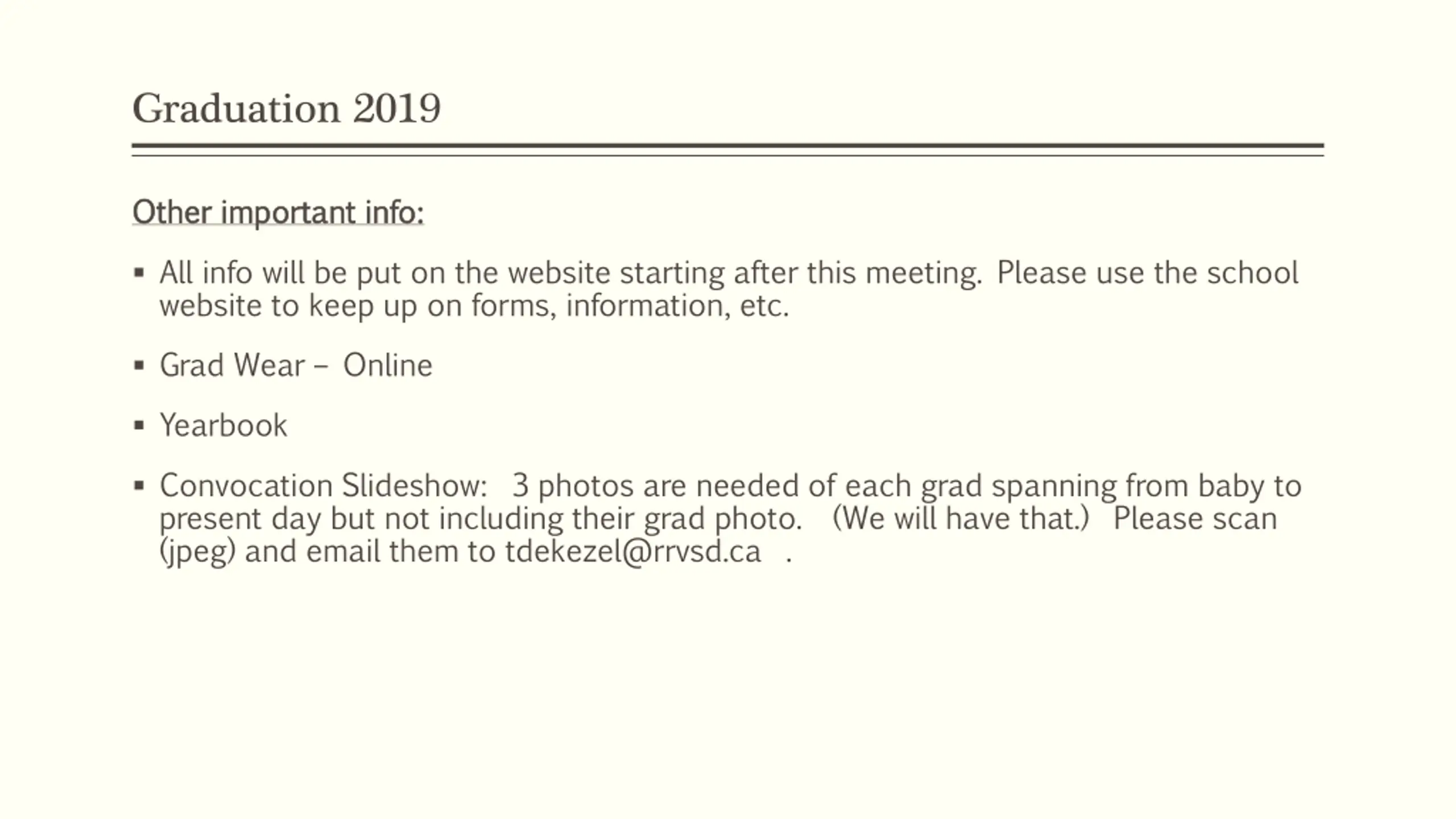 Graduation 2019 Other important info: Other important info: All info will be put on the website starting after this meeting. Please use the school website to keep up on forms, information, etc. Grad Wear Online Yearbook Convocation Slideshow: 3 photos are needed of each grad spanning from baby to present day but not including their grad photo. (We will have that.) Please scan (jpeg) and email them to tdekezel@rrvsd.ca .