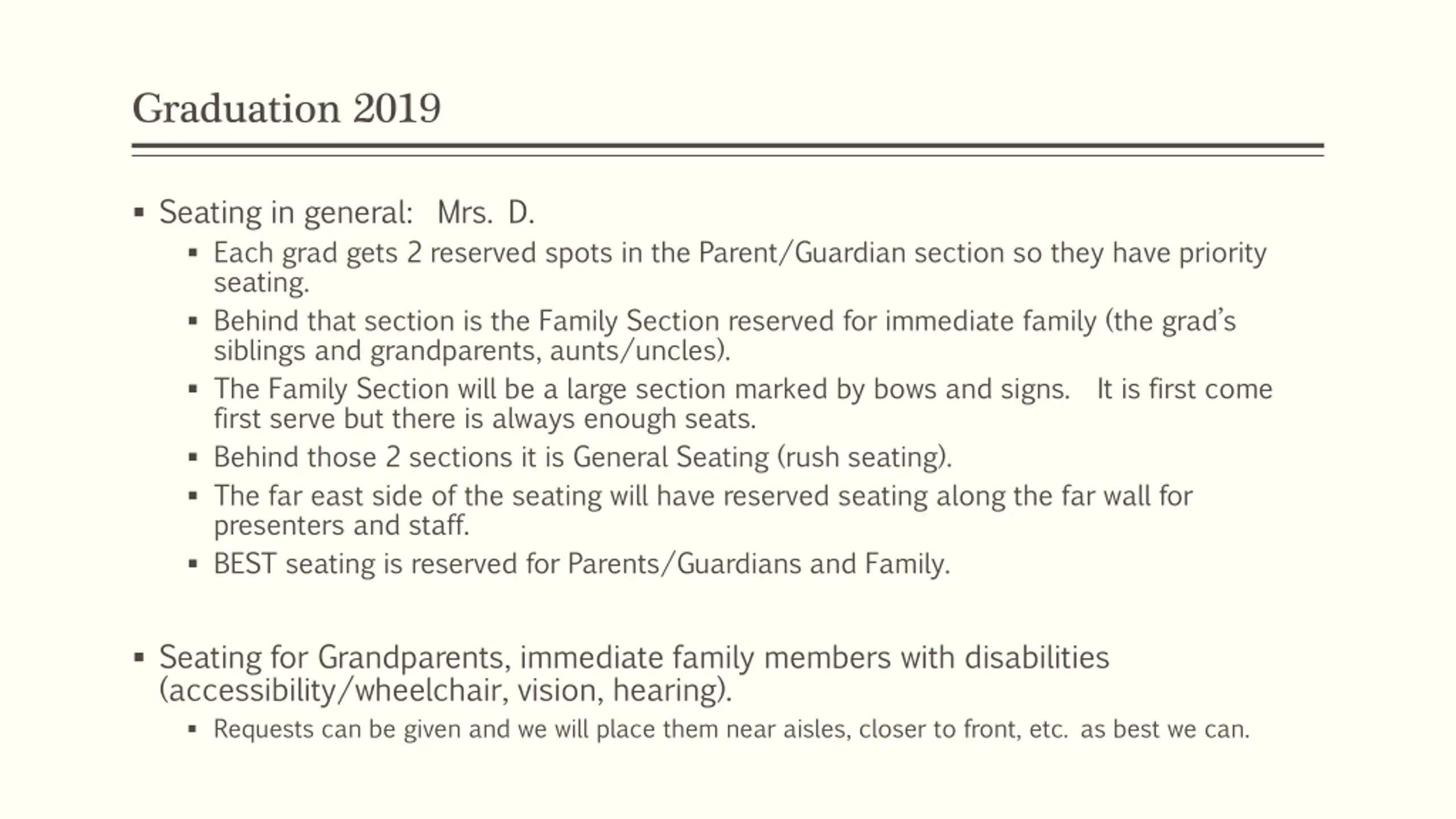 Graduation 2019 Seating in general: Mrs. D. Each grad gets 2 reserved spots in the Parent/Guardian section so they have priority seating. Behind that section is the Family Section reserved for immediate family (the grad s siblings and grandparents, aunts/uncles). The Family Section will be a large section marked by bows and signs. It is first come first serve but there is always enough seats. Behind those 2 sections it is General Seating (rush seating). The far east side of the seating will have reserved seating along the far wall for presenters and staff. BEST seating is reserved for Parents/Guardians and Family. Seating for Grandparents, immediate family members with disabilities (accessibility/wheelchair, vision, hearing). Requests can be given and we will place them near aisles, closer to front, etc. as best we can.