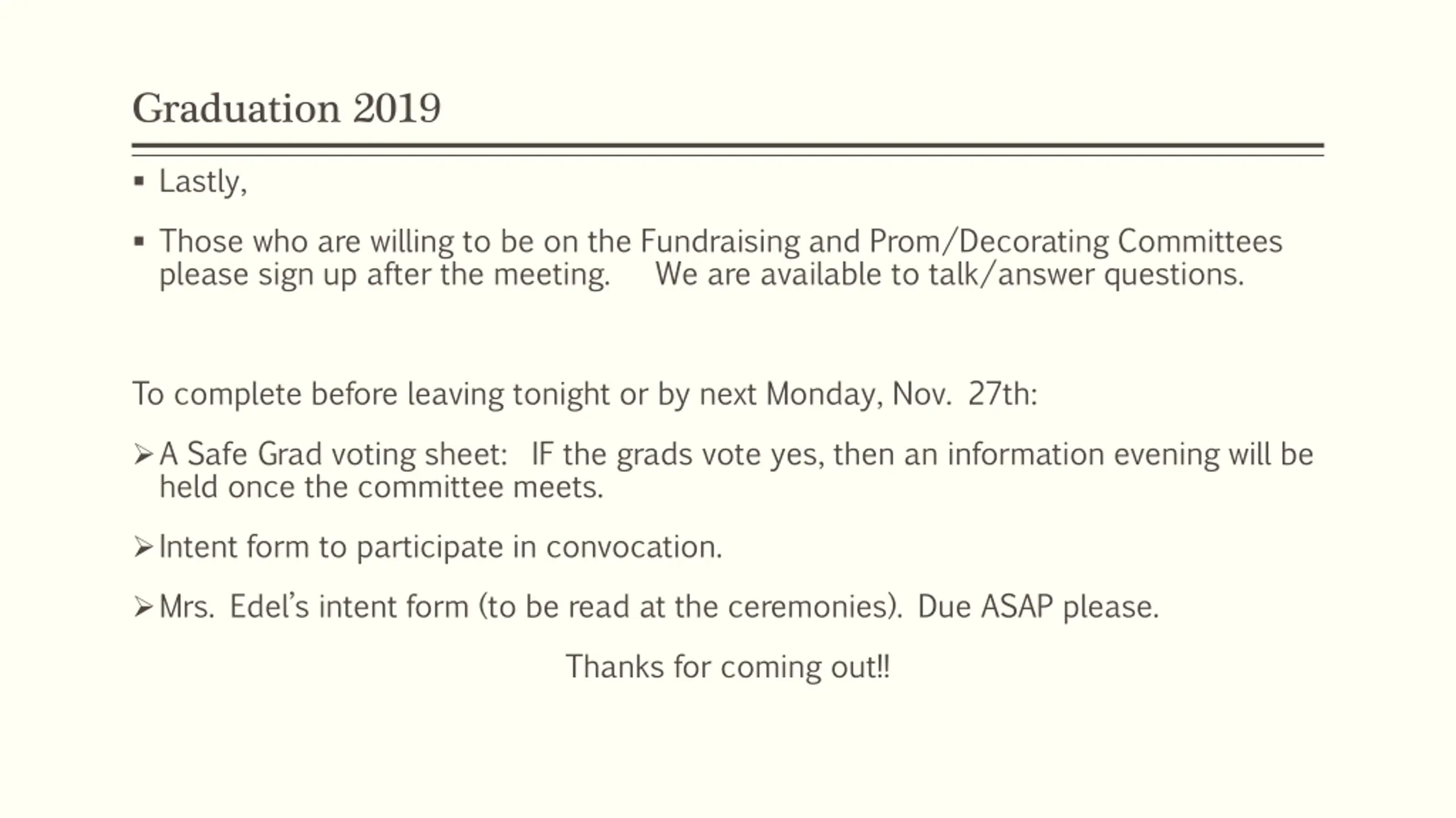Graduation 2019 Lastly, Those who are willing to be on the Fundraising and Prom/Decorating Committees please sign up after the meeting. We are available to talk/answer questions. To complete before leaving tonight or by next Monday, Nov. 27th: A Safe Grad voting sheet: IF the grads vote yes, then an information evening will be held once the committee meets. Intent form to participate in convocation. Mrs. Edel s intent form (to be read at the ceremonies). Due ASAP please. Thanks for coming out!!