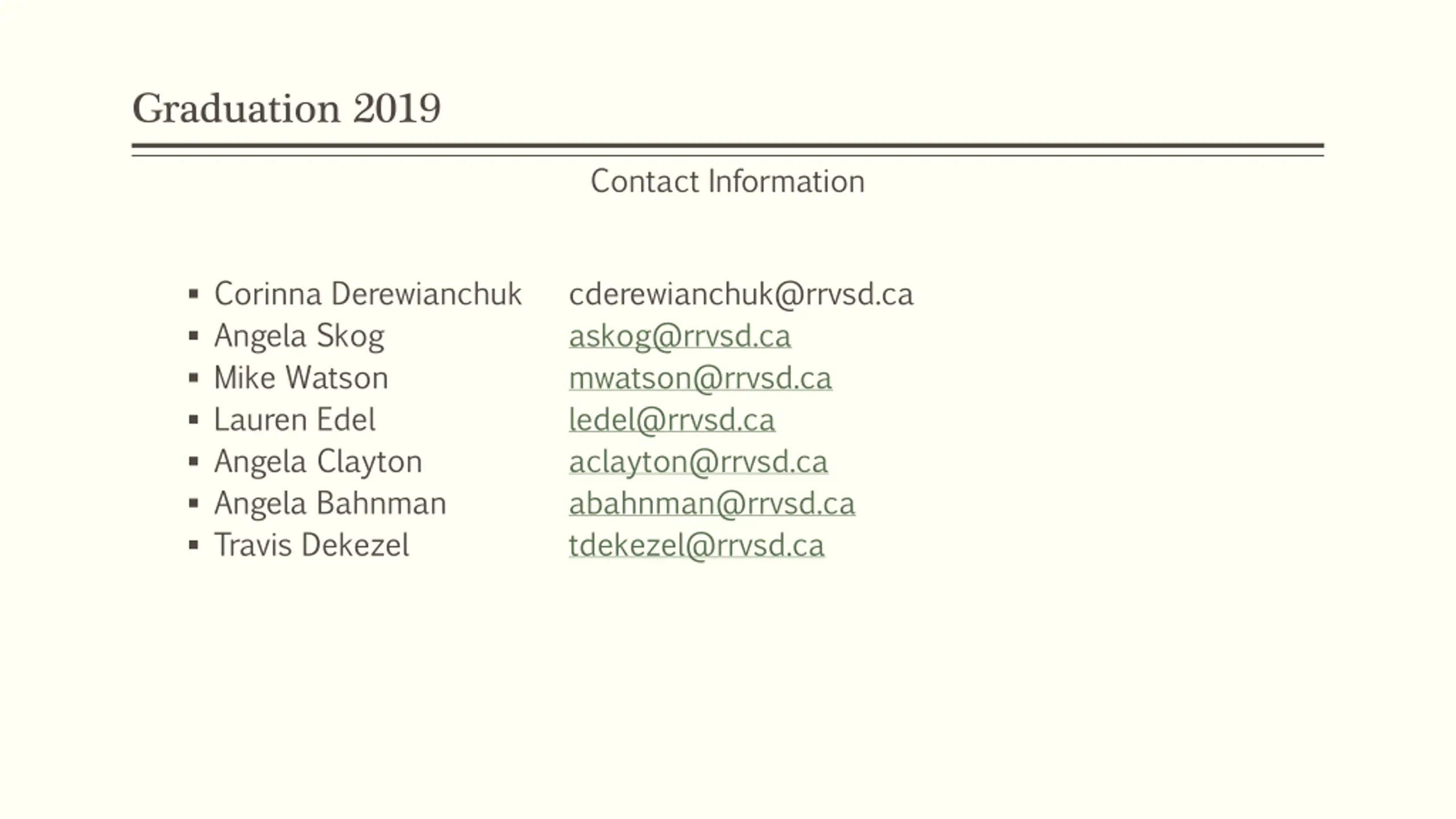 Graduation 2019 Contact Information Corinna Derewianchuk Angela Skog Mike Watson Lauren Edel Angela Clayton Angela Bahnman Travis Dekezel cderewianchuk@rrvsd.ca askog@rrvsd.ca mwatson@rrvsd.ca ledel@rrvsd.ca aclayton@rrvsd.ca abahnman@rrvsd.ca tdekezel@rrvsd.ca